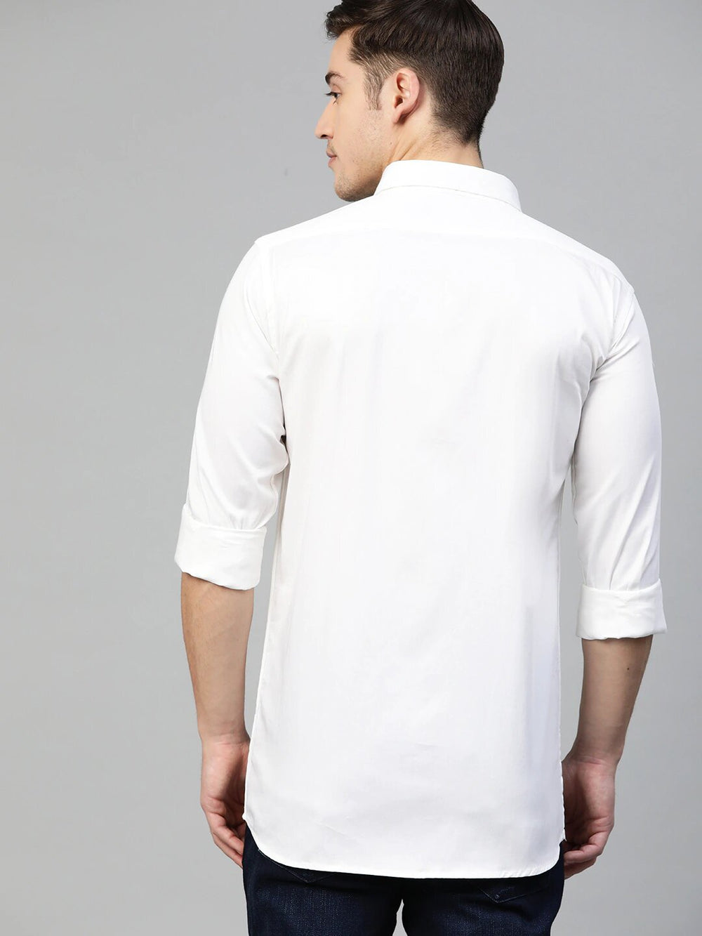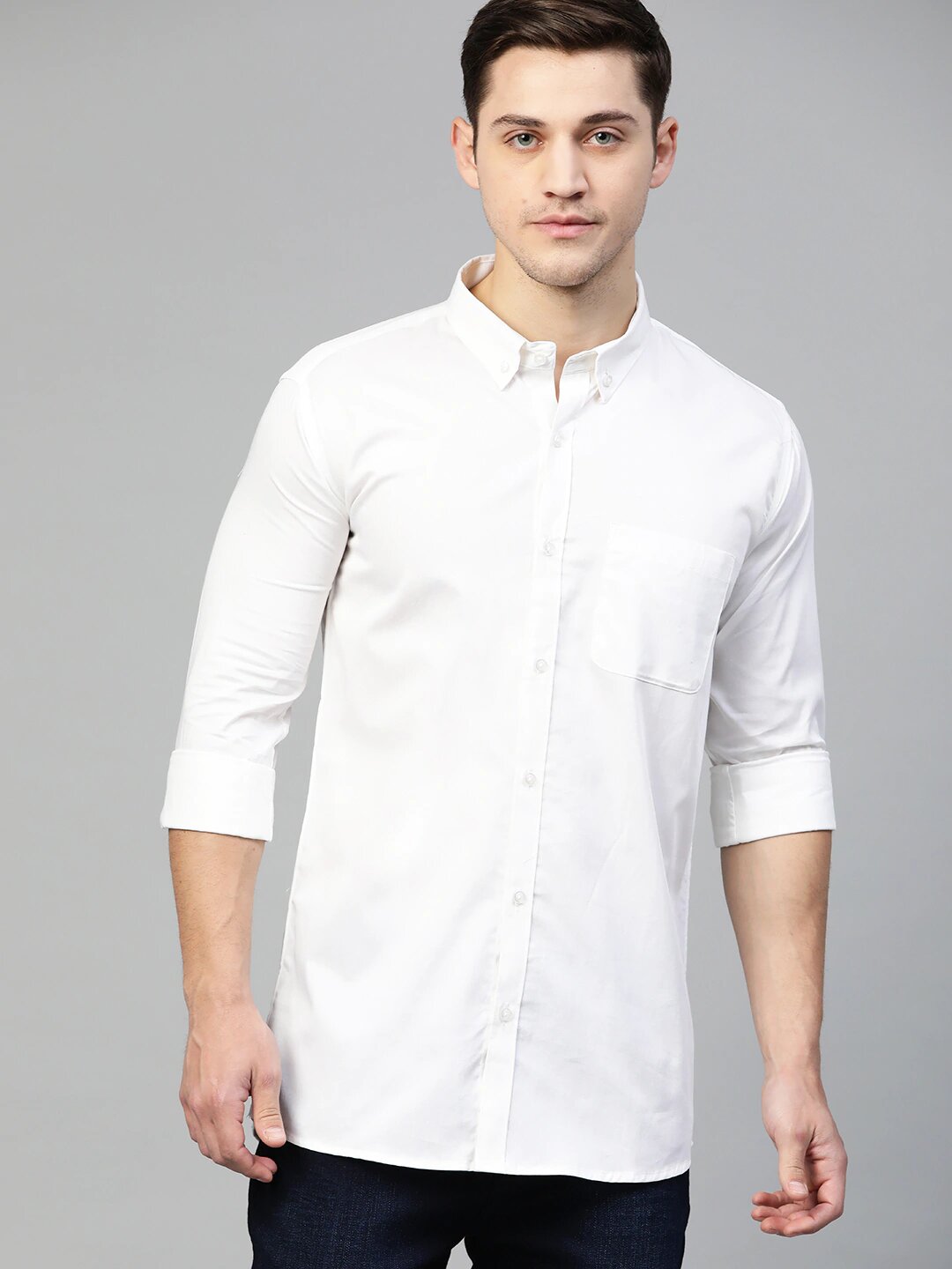 White solid casual shirt, has a button-down collar, long sleeves, button placket, curved hem, and 1 patch pocket