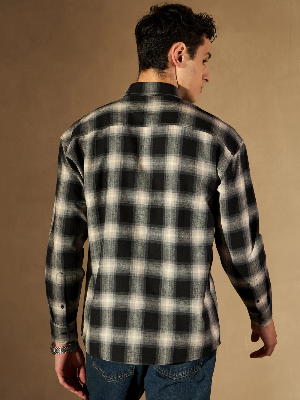 Black and white tartan checked opaque casual shirt ,has a spread collar, button placket, 2 flap pockets, long regular sleeves, curved hem