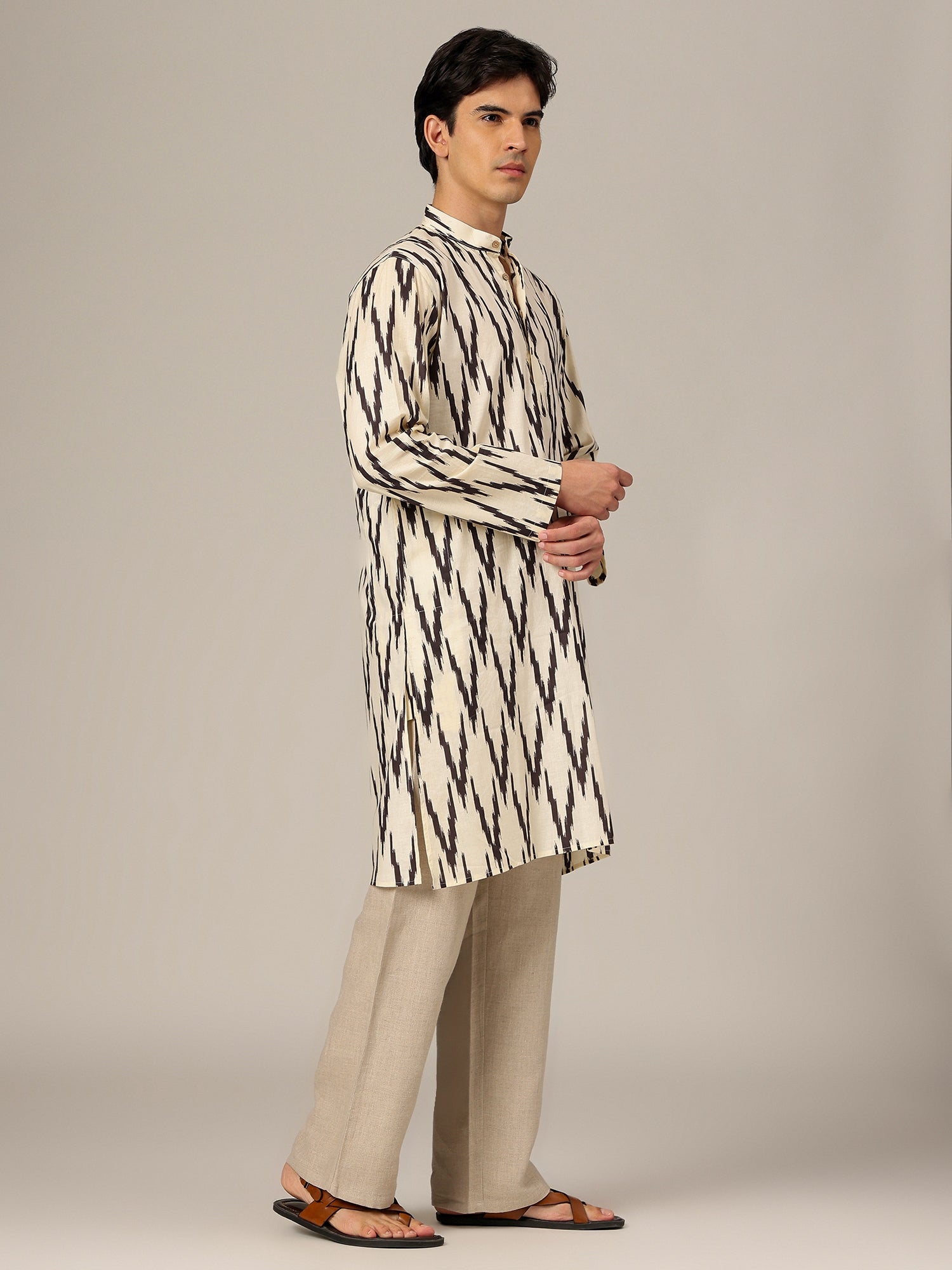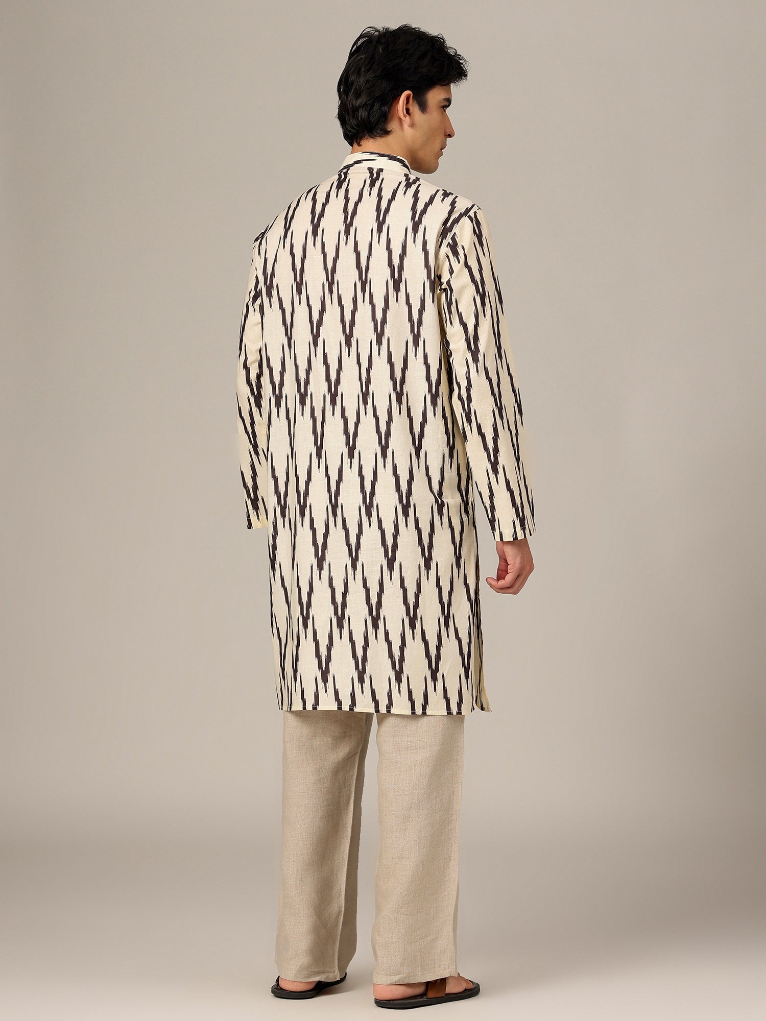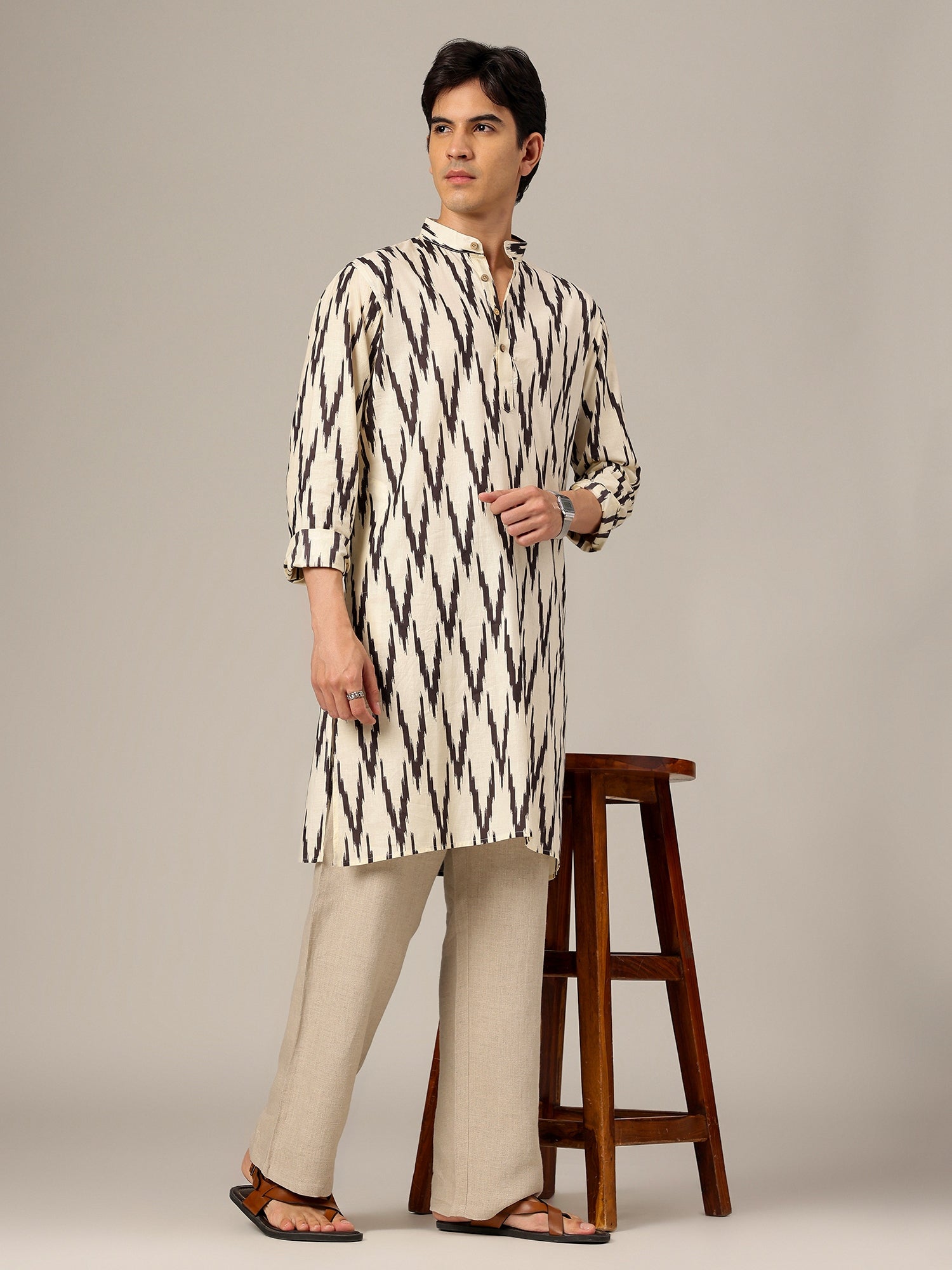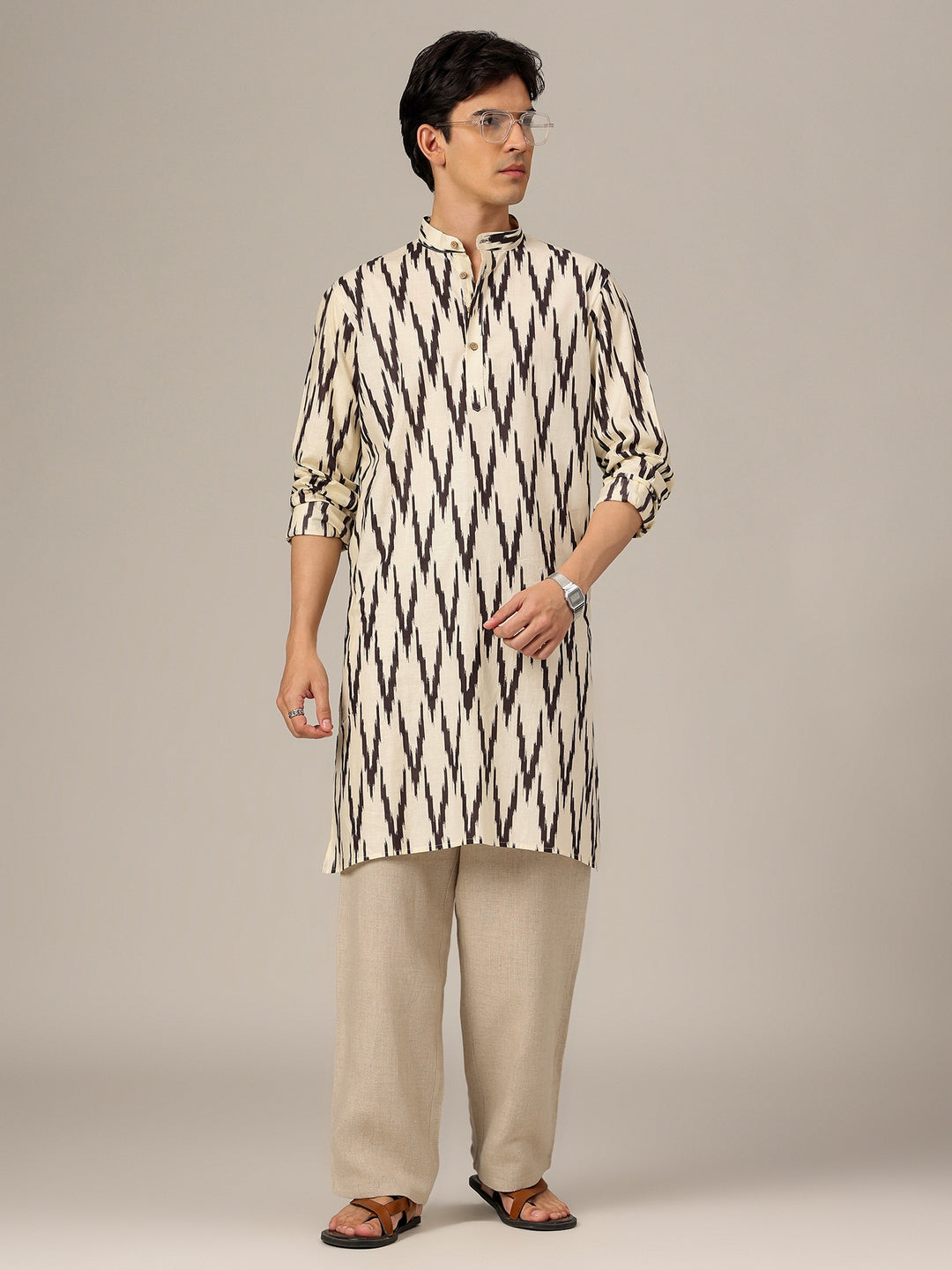 With its modern geometric print and classic Mandarin collar, this cotton kurta combines tradition with contemporary flair—perfect for men who value both comfort and understated elegance.