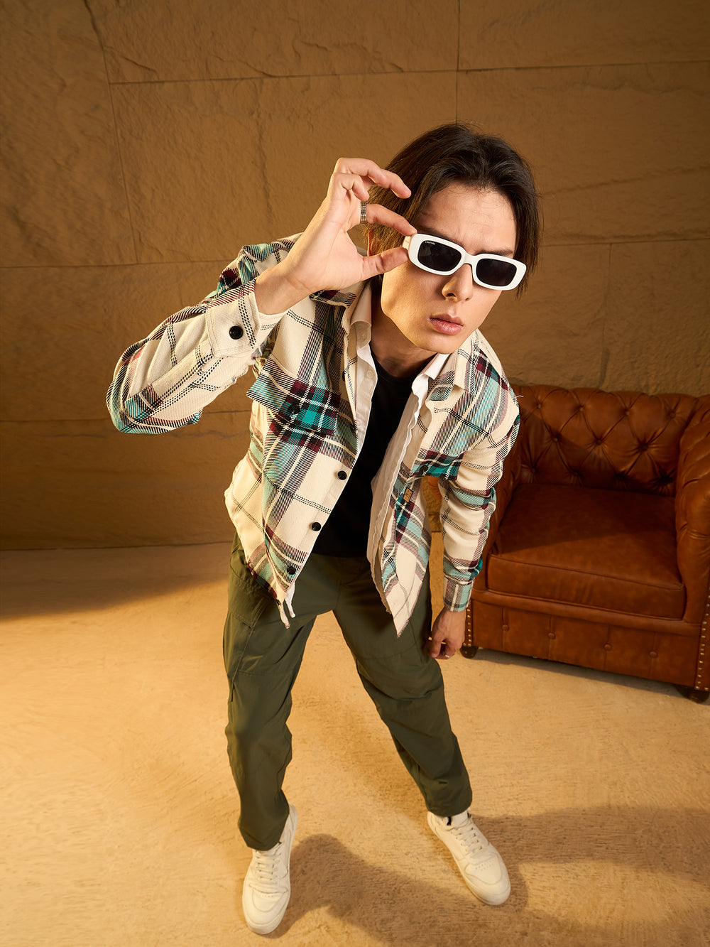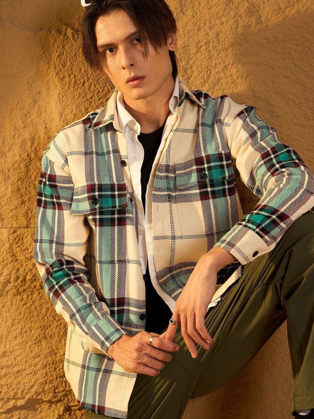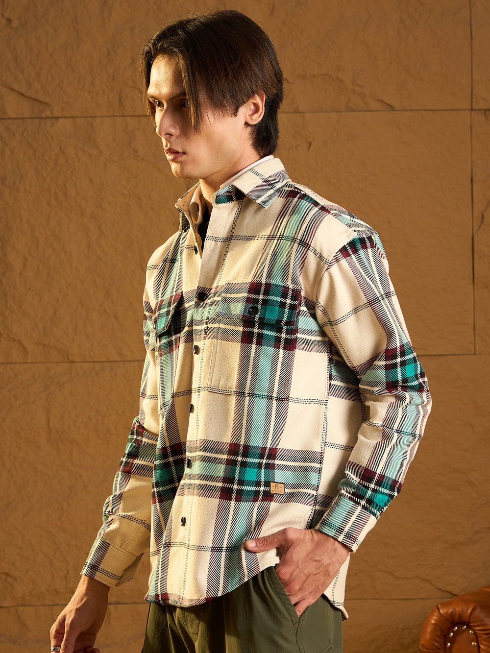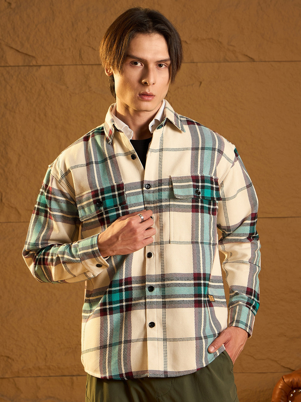 A cozy, versatile oversized Checked shacket crafted from soft cotton with a double-pocket design and dropped shoulders for a relaxed fit. The full sleeves and timeless check pattern add casual-chic appeal, perfect for layering any season.