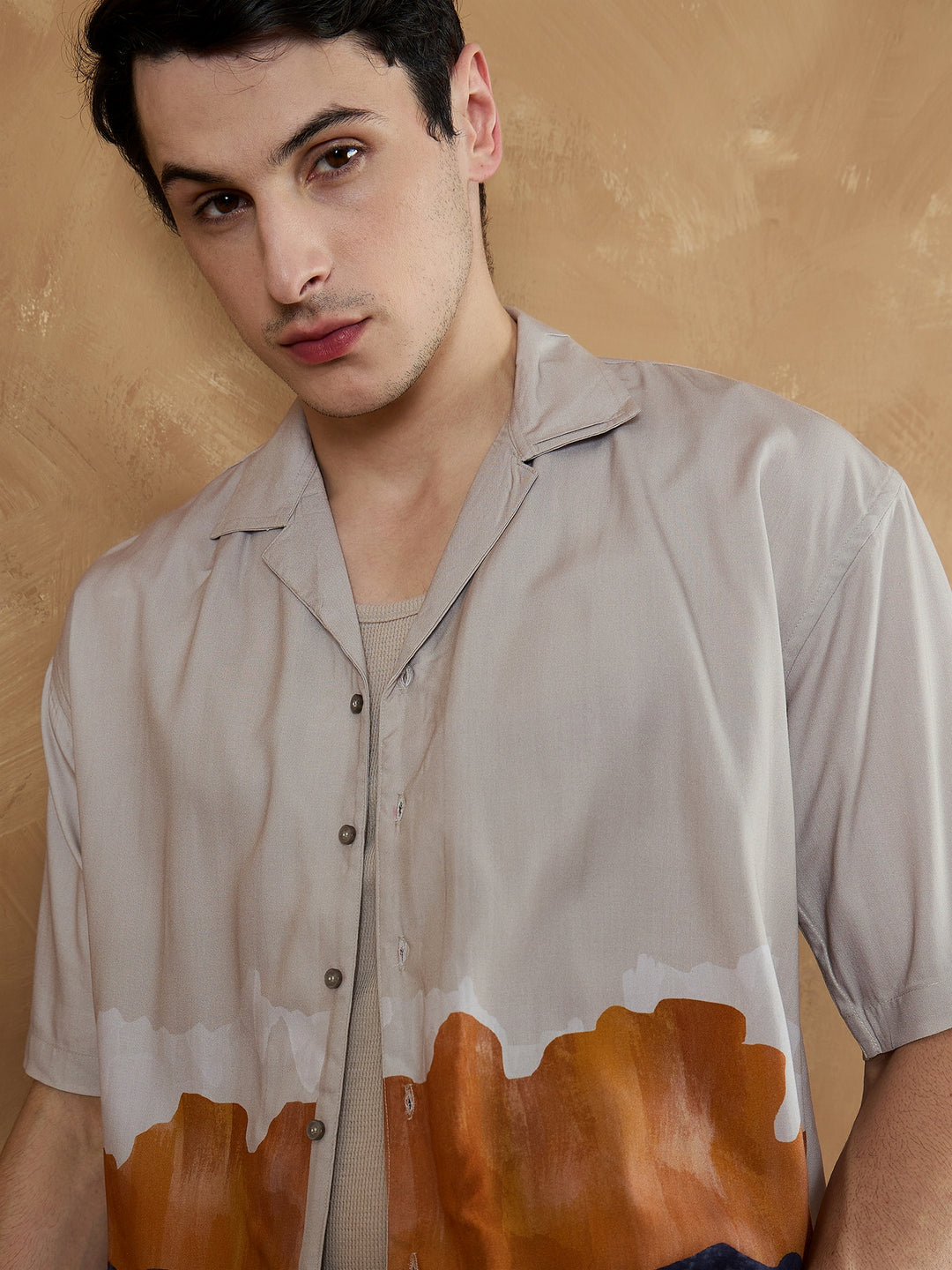 With its fluid drape and graphic color blocking, this shirt redefines modern casual. The Cuban collar and oversize fit give it a relaxed yet fashion-forward appeal for all-day wear.