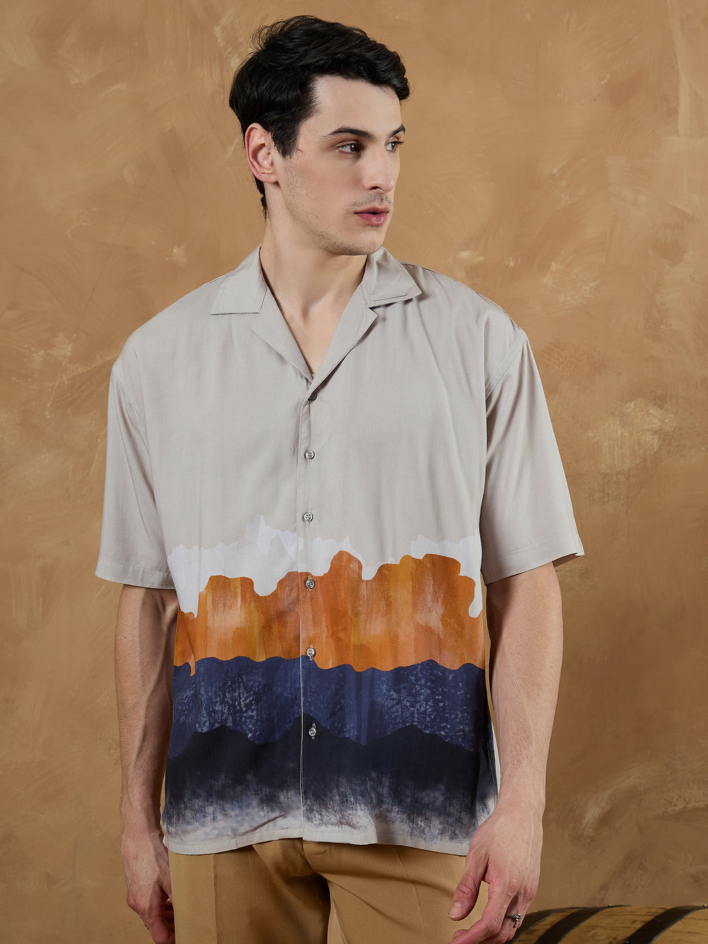 This Oversize Fit shirt in soft viscose rayon features a bold color blocked placement print, Cuban collar, drop-shoulder, and long sleeves—perfect for making a casual style statement with ease and comfort.