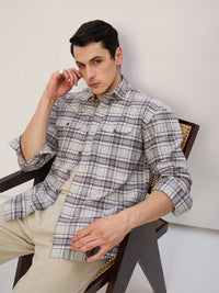 Cream & Brown: Full Sleeves Double Pocket Checkered Shirt