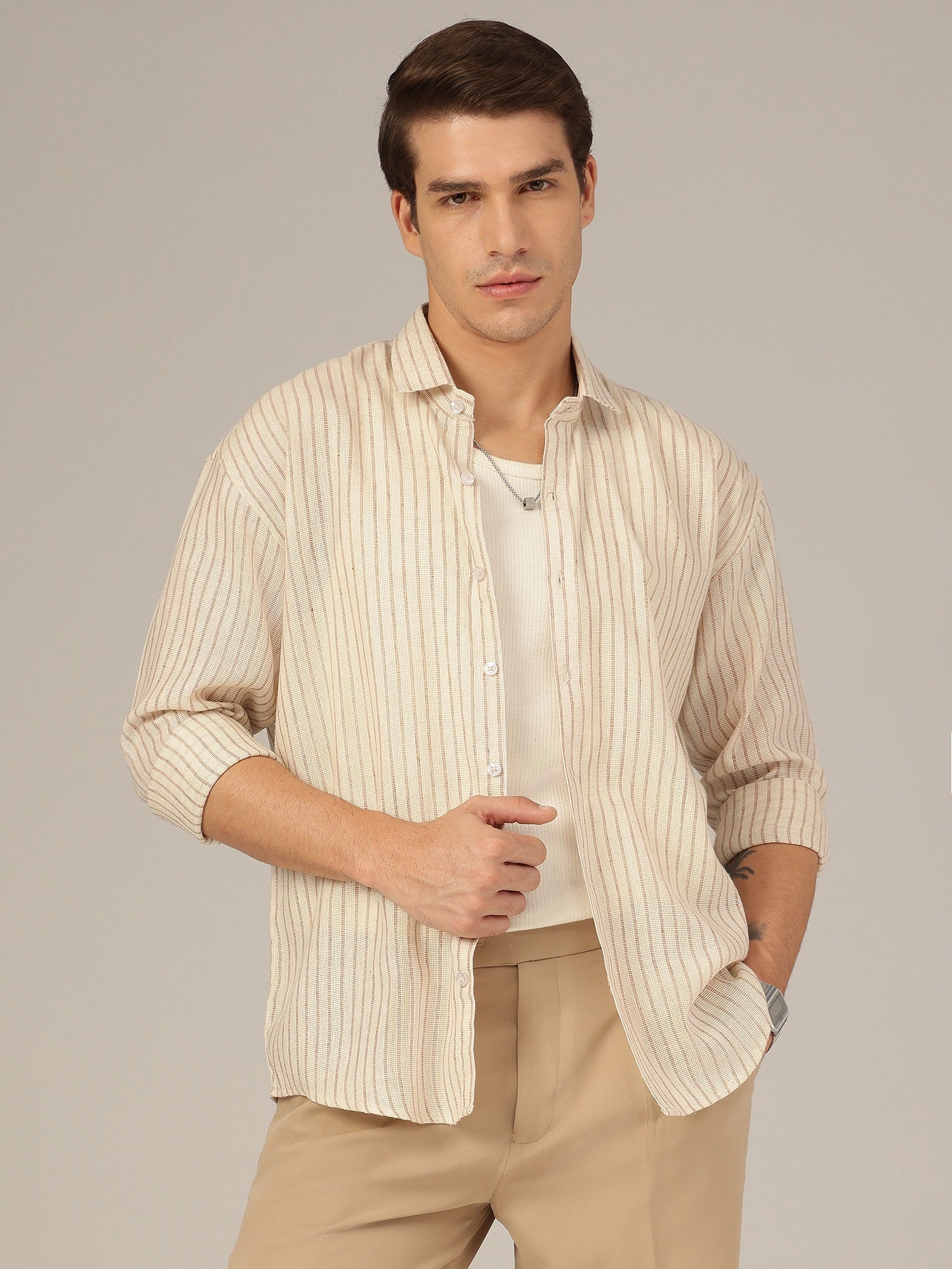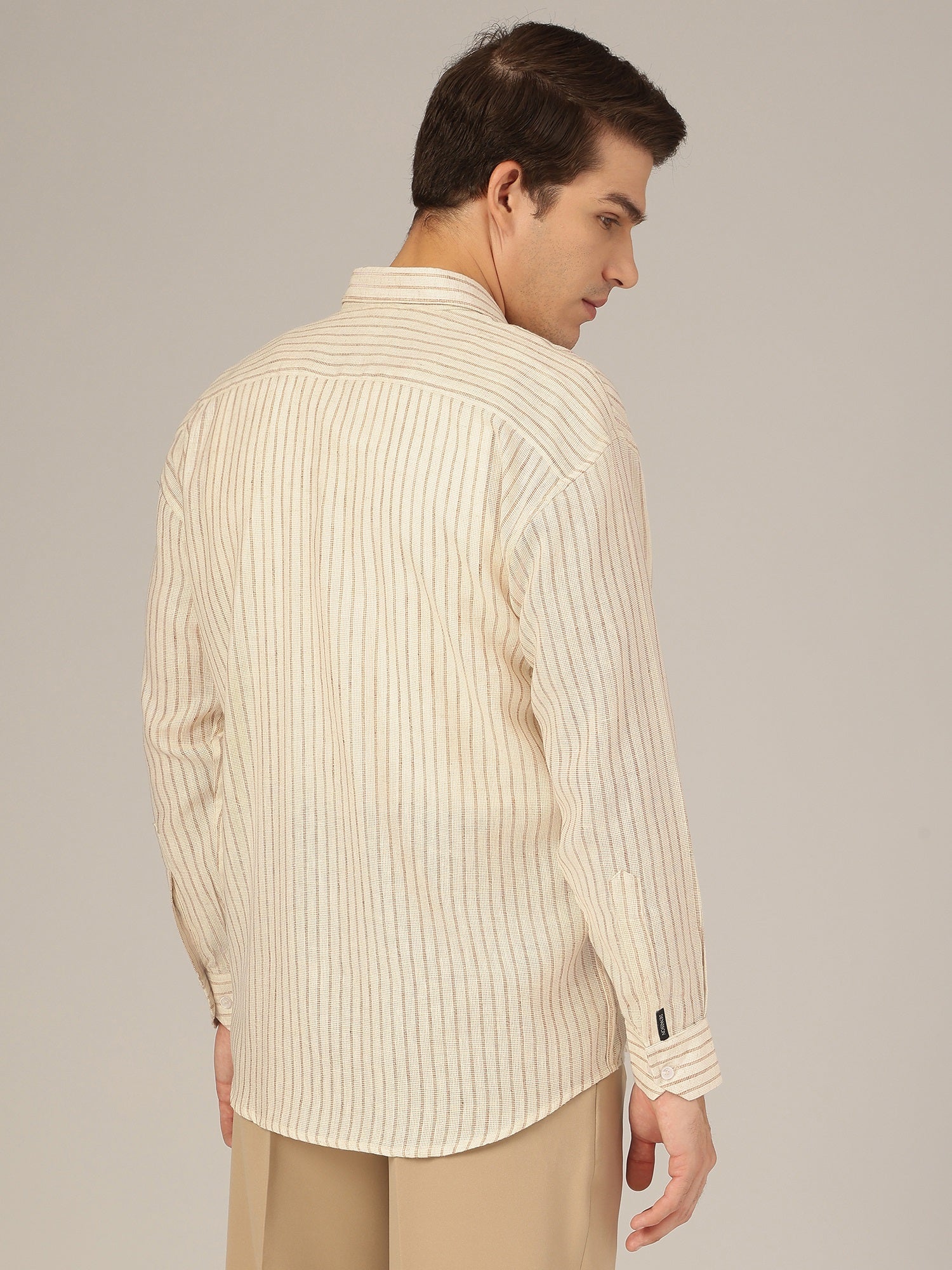 Cream & Brown: Vertical Striped Oversized Casual Shirt