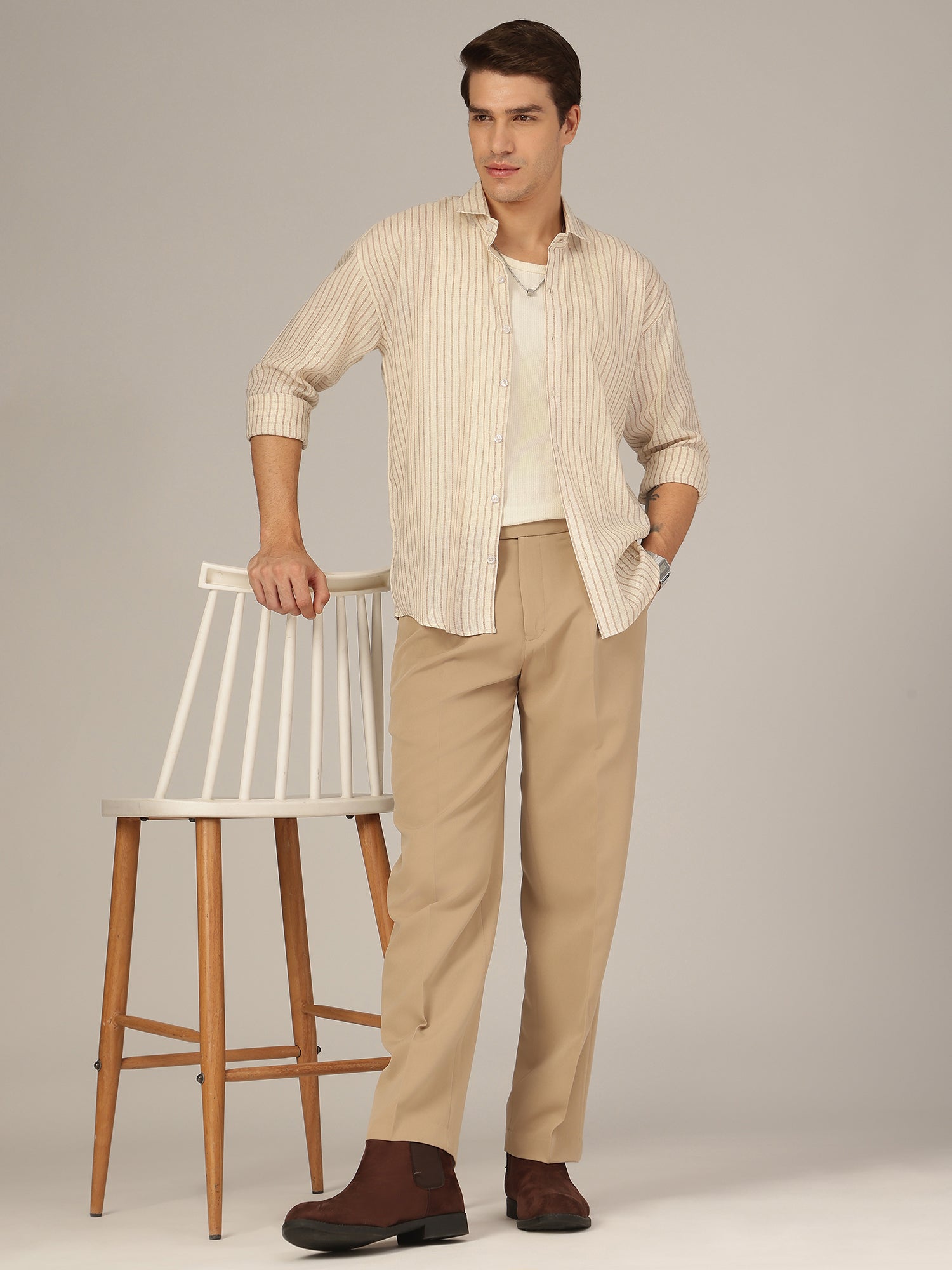 This Casual Shirt brings a trendy oversized vibe with classic vertical stripes—perfect for layering or wearing solo for an easy-going look.