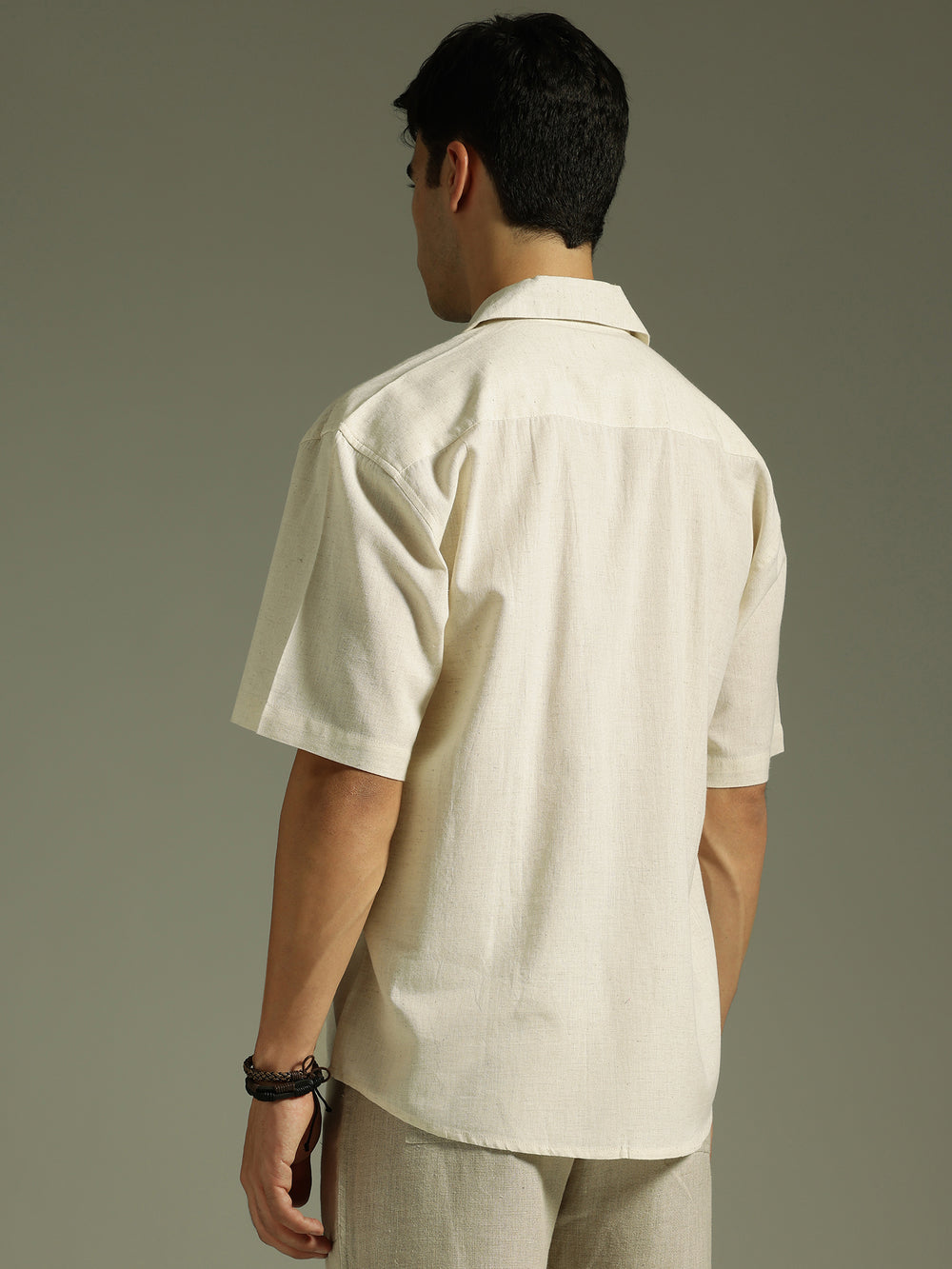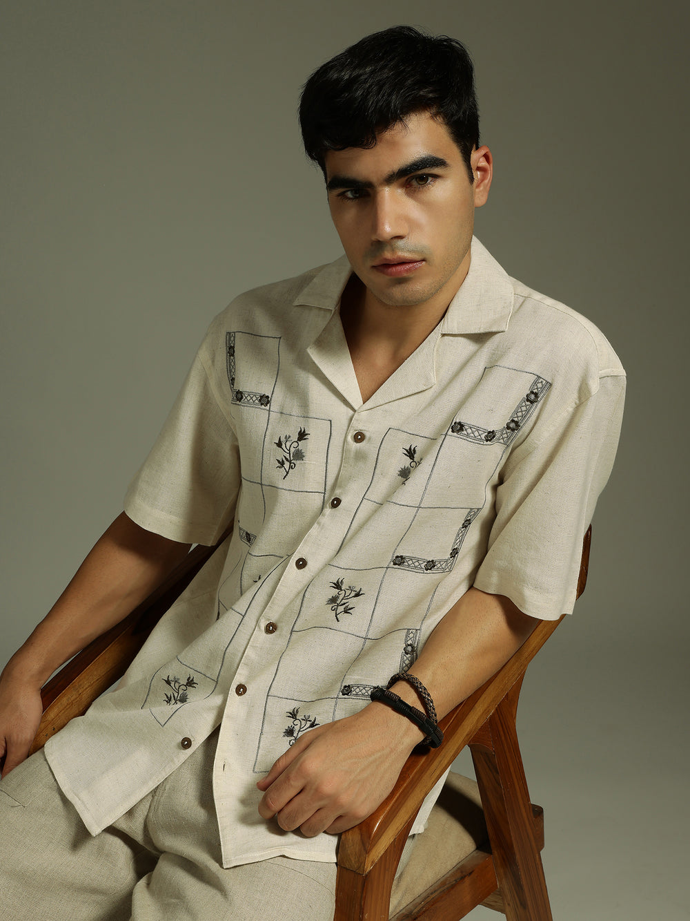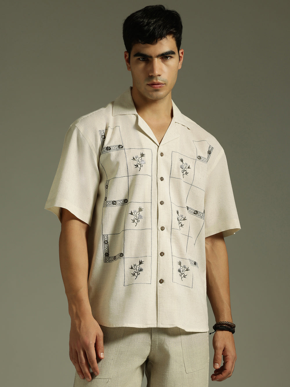 This Oversized Cotton Shirt features a classic Cuban Collar, intricate Embroidery, Drop-Shoulder design, Half Sleeves, and a Curved Hemline, blending comfort with effortless contemporary style for your everyday wardrobe.