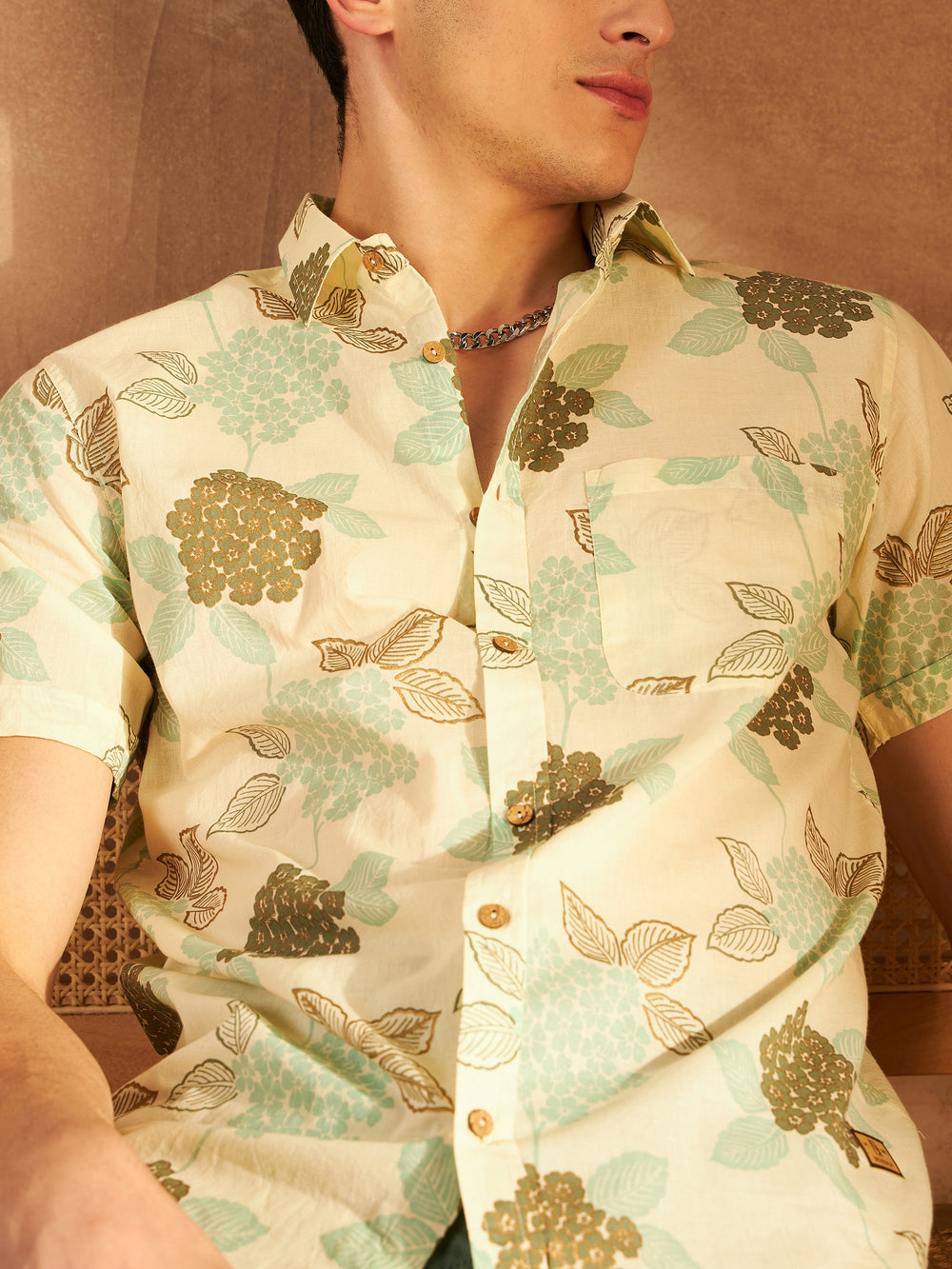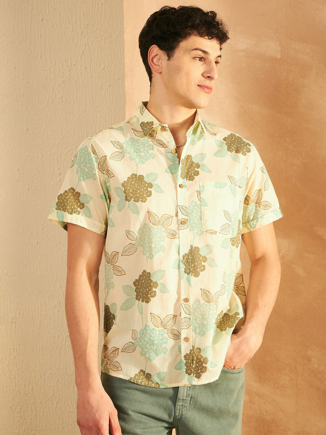 Cream-coloured floral printed opaque Casual shirt ,has a spread collar, button placket, 1 patch pocket, long regular sleeves, curved hem