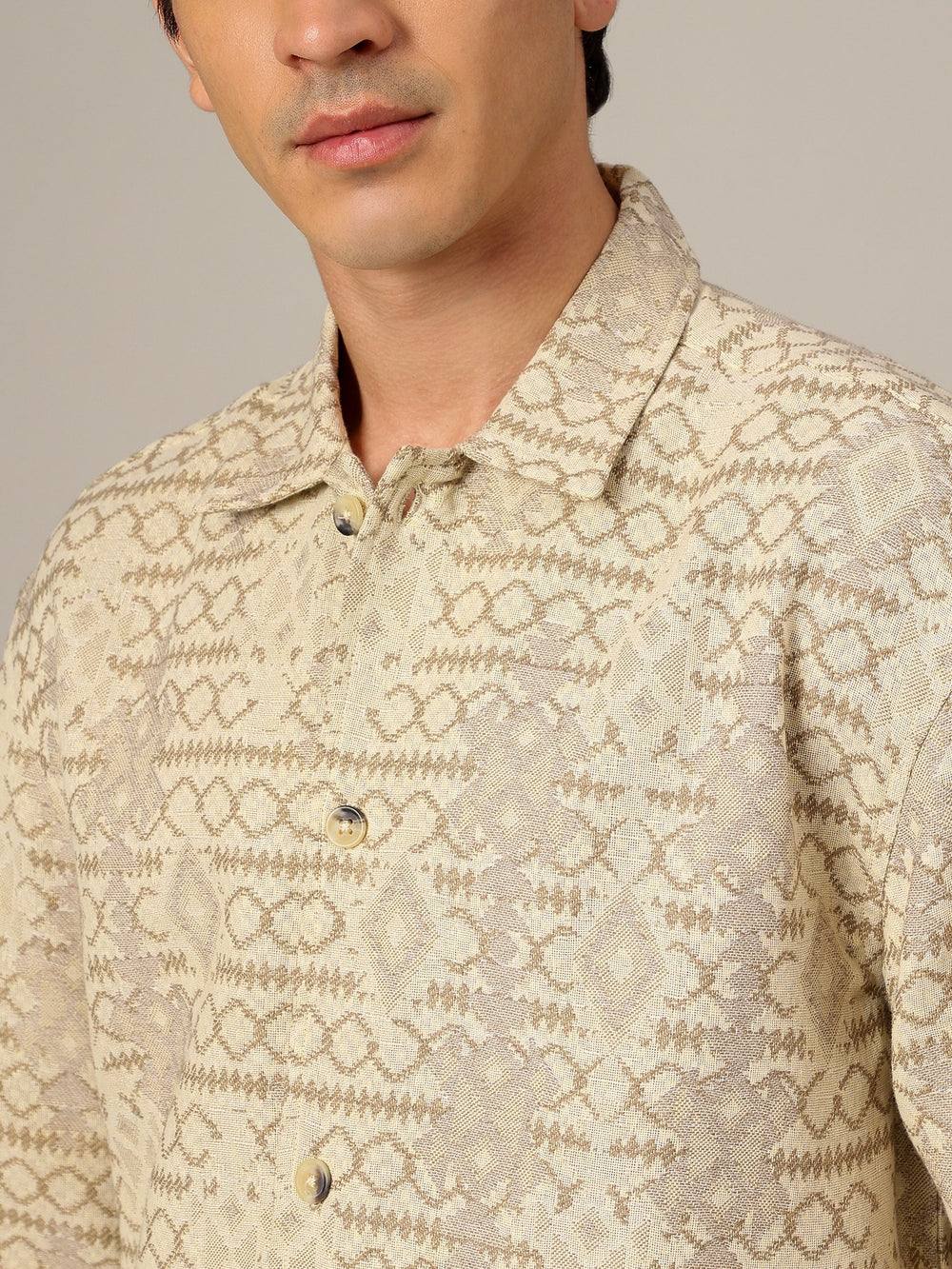 Step up your style with this Oversized Fit, Full Sleeves Casual Shacket featuring a Drop-Shoulder, Jacquard Print, 2 welt pockets, spread collar, and crafted in breathable cotton for all-day comfort.