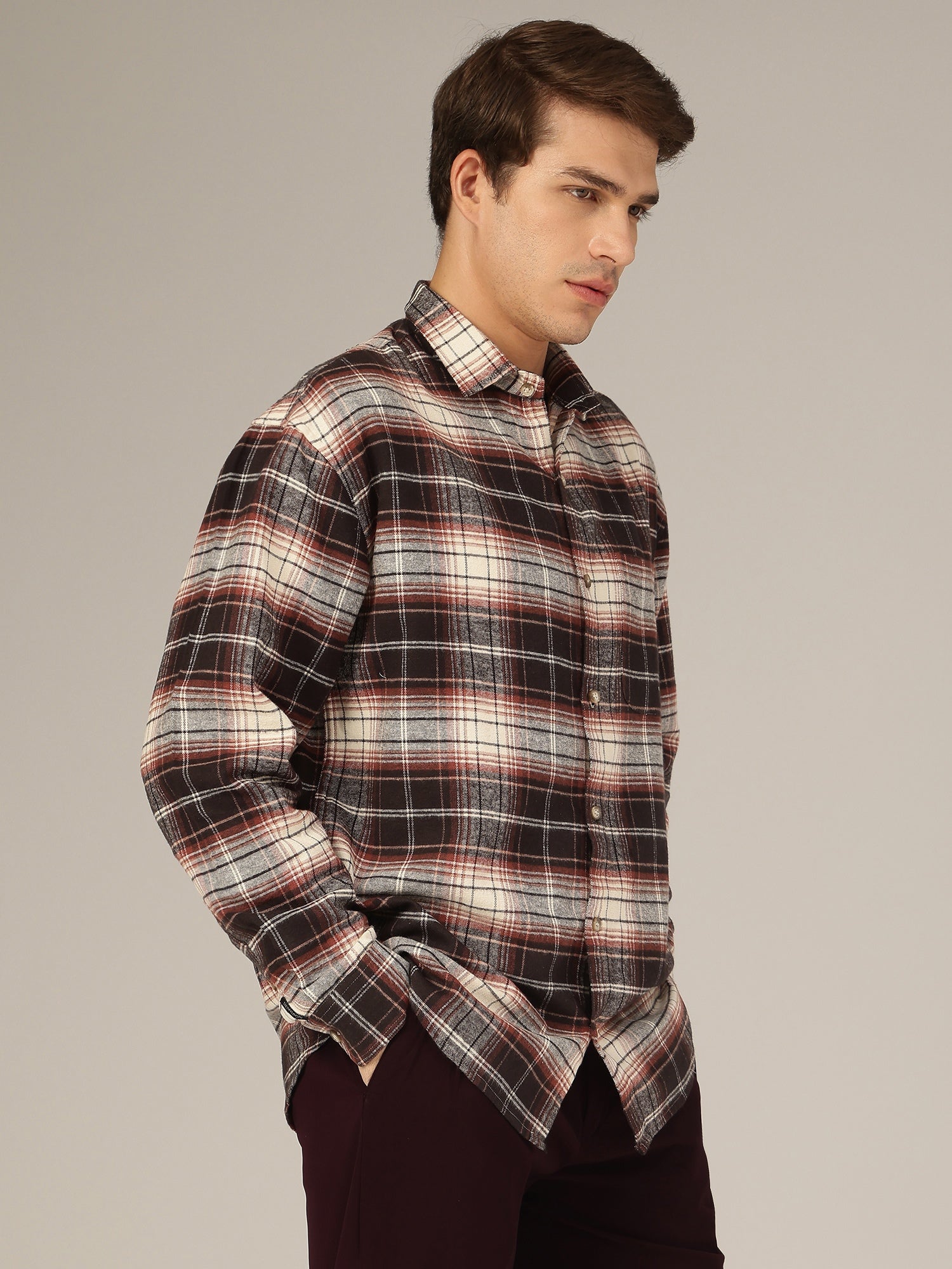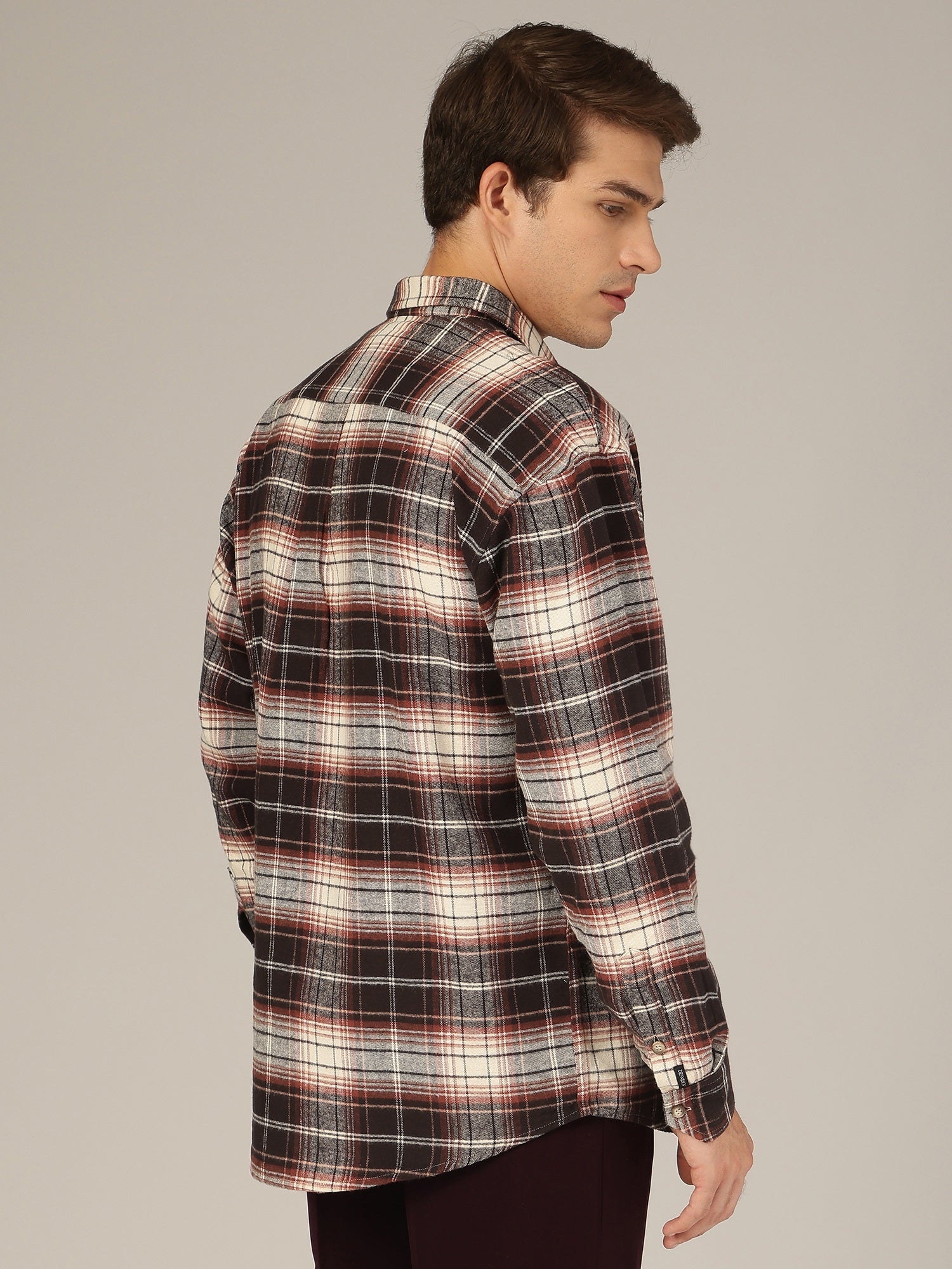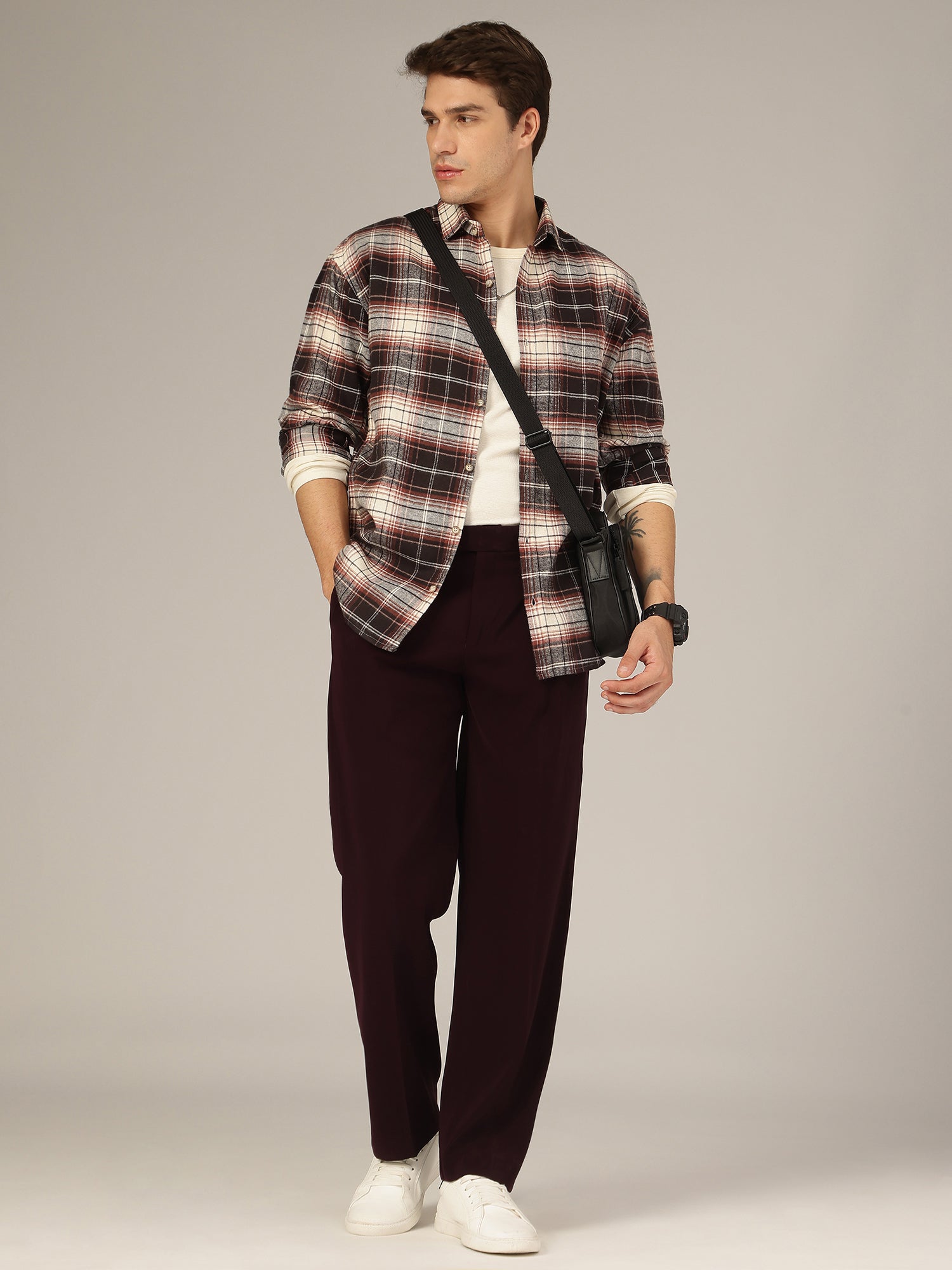 Cream & Meroon: Checkered Drop-Shoulder Oversized Casual Shirt