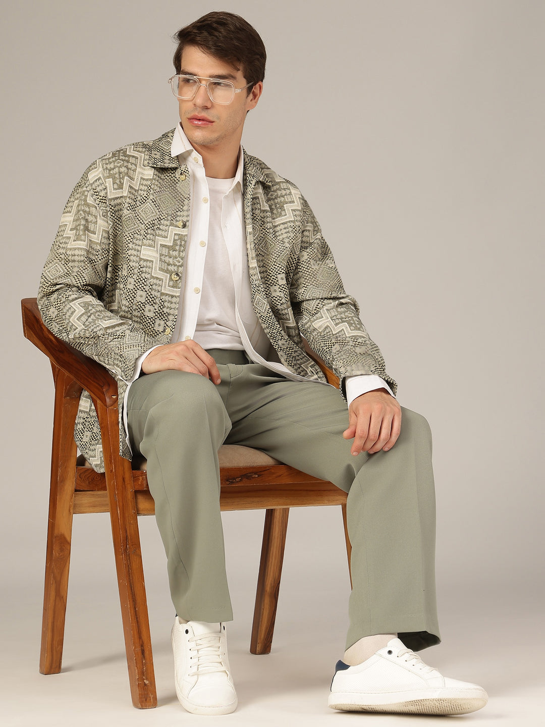 Cream & Olive: Jacquard Printed Oversized Drop-Shoulder Shacket
