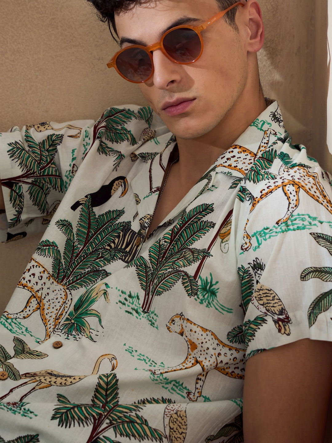 Cream animal printed opaque Casual shirt ,has a cuban collar, button placket, short regular sleeves, straight hem
