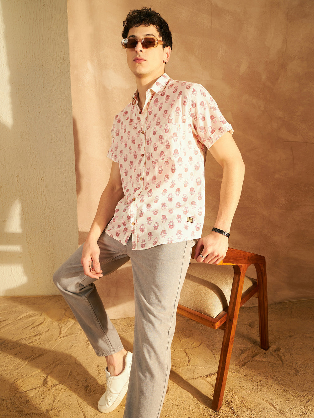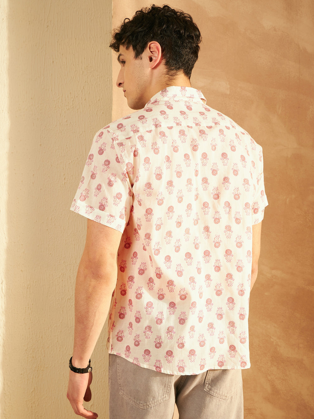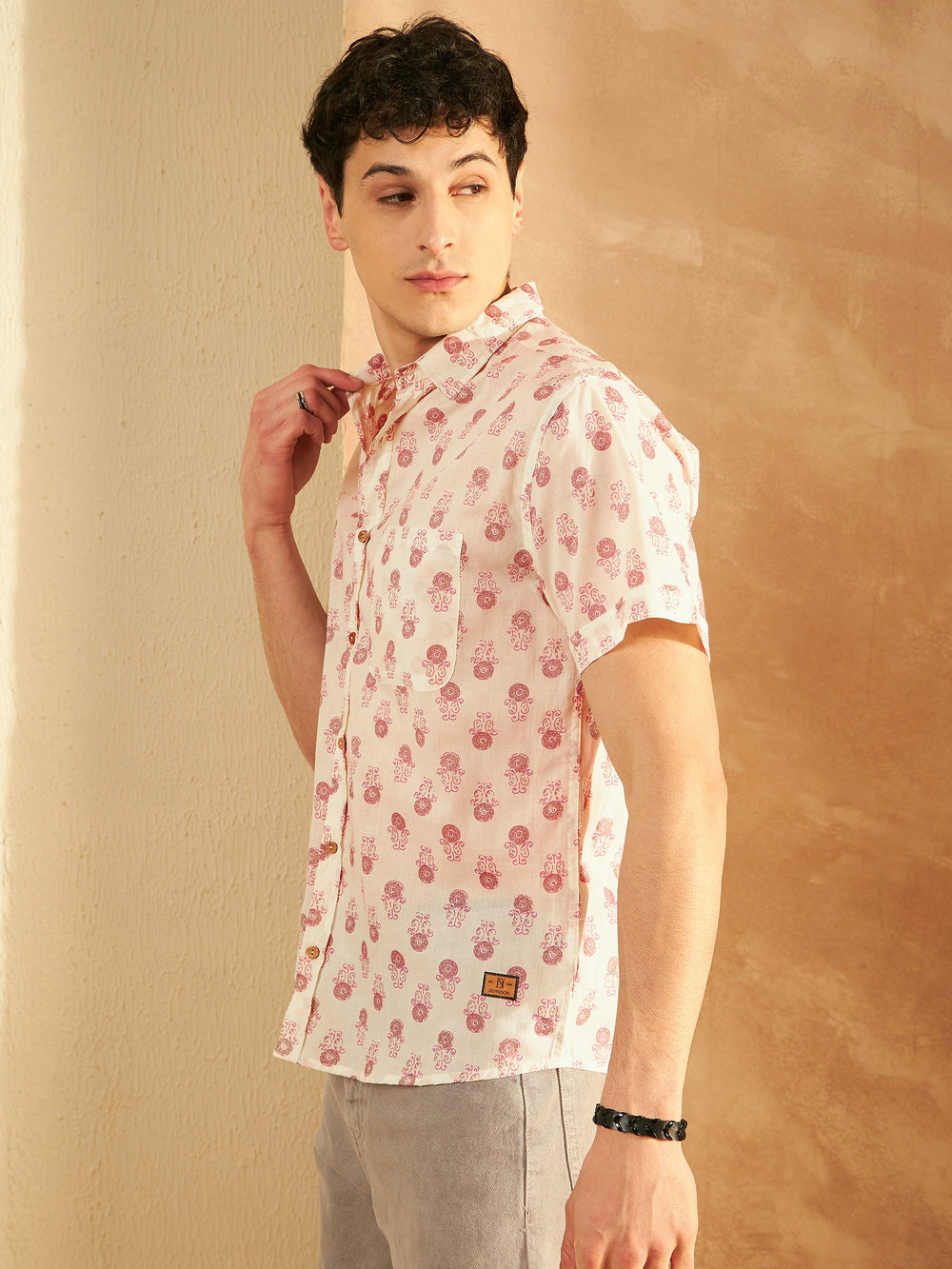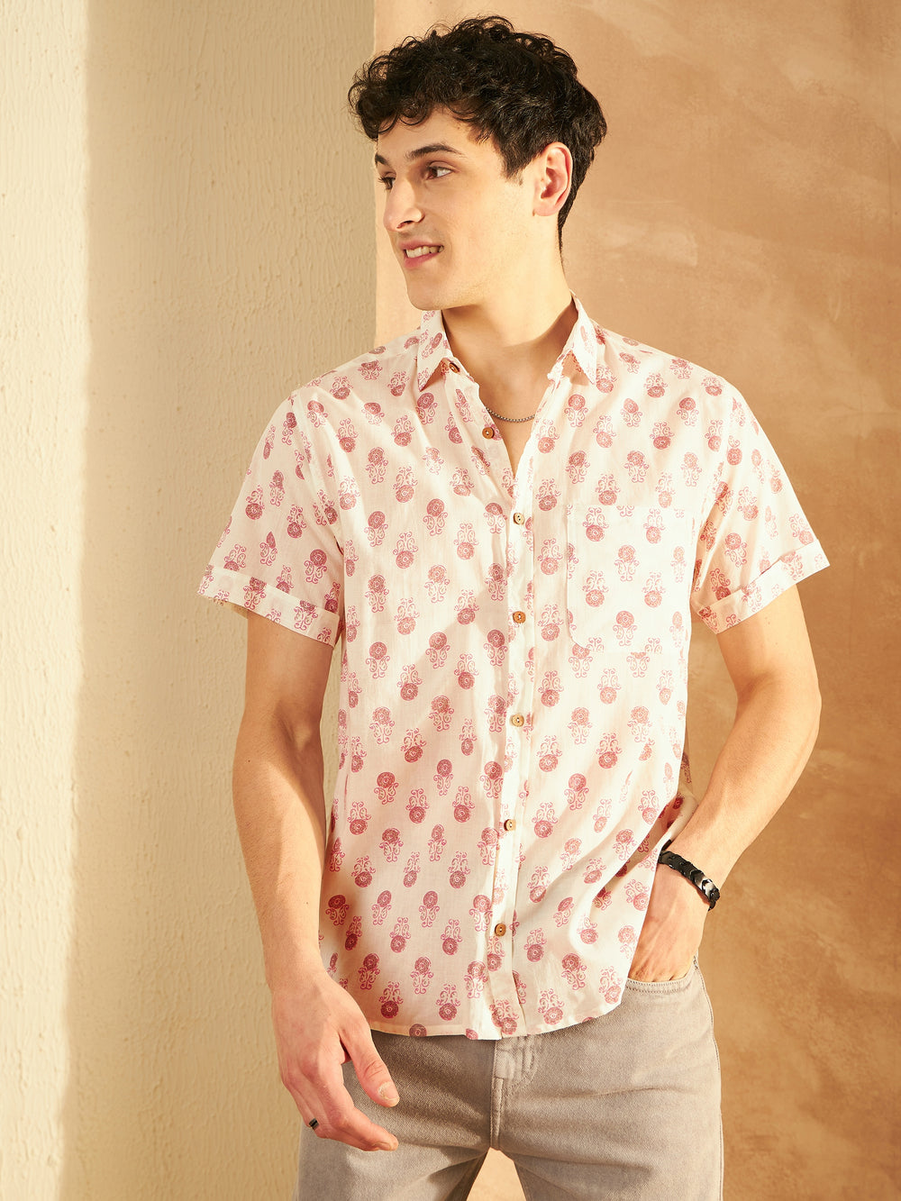 Cream-coloured & Pink ethnic motifs block printed opaque oversized casual shirt, has a spread collar, button placket, 1 patch pocket, short regular sleeves, curved hem