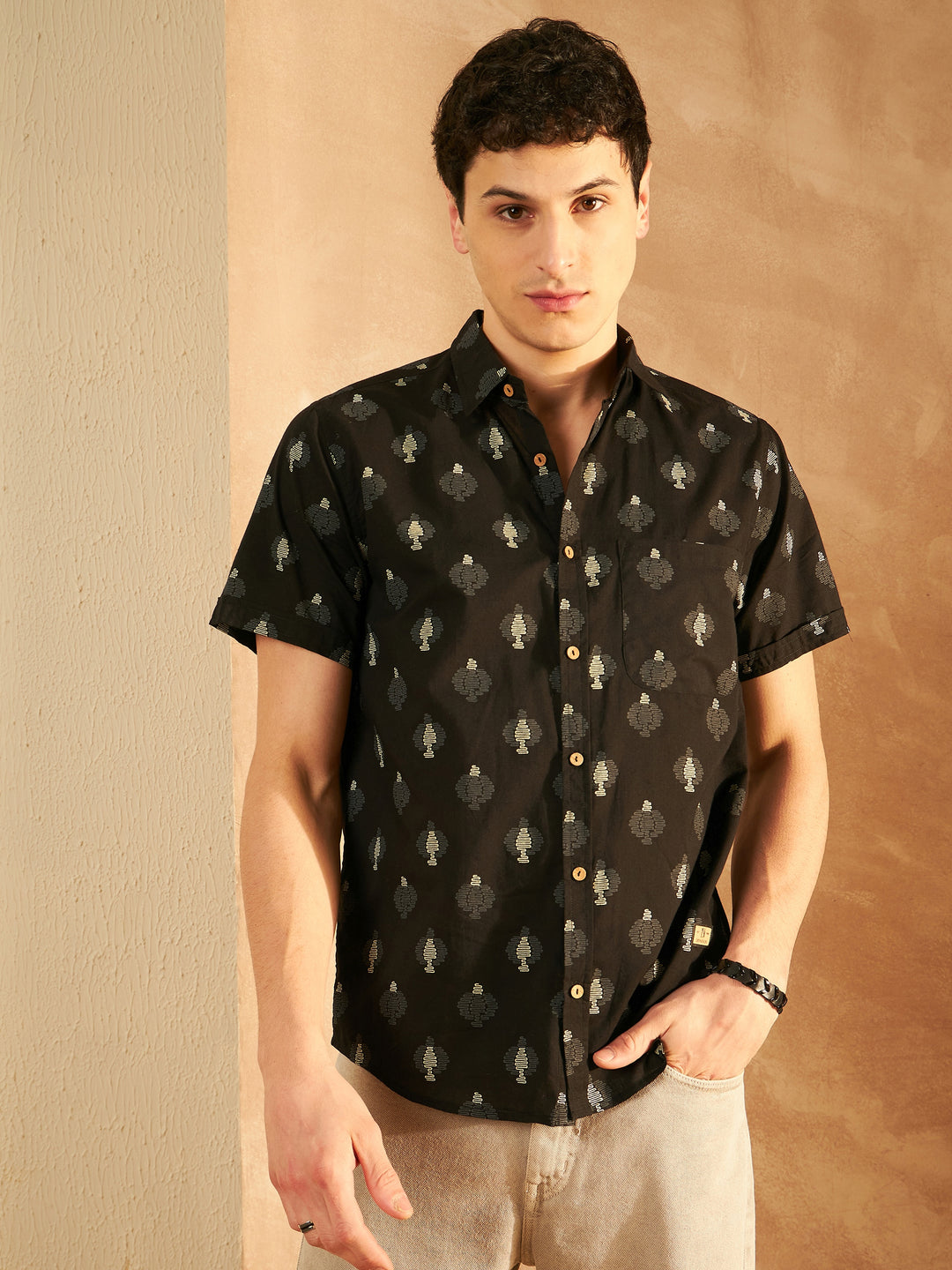Black: Half Sleeves Block Printed Shirt