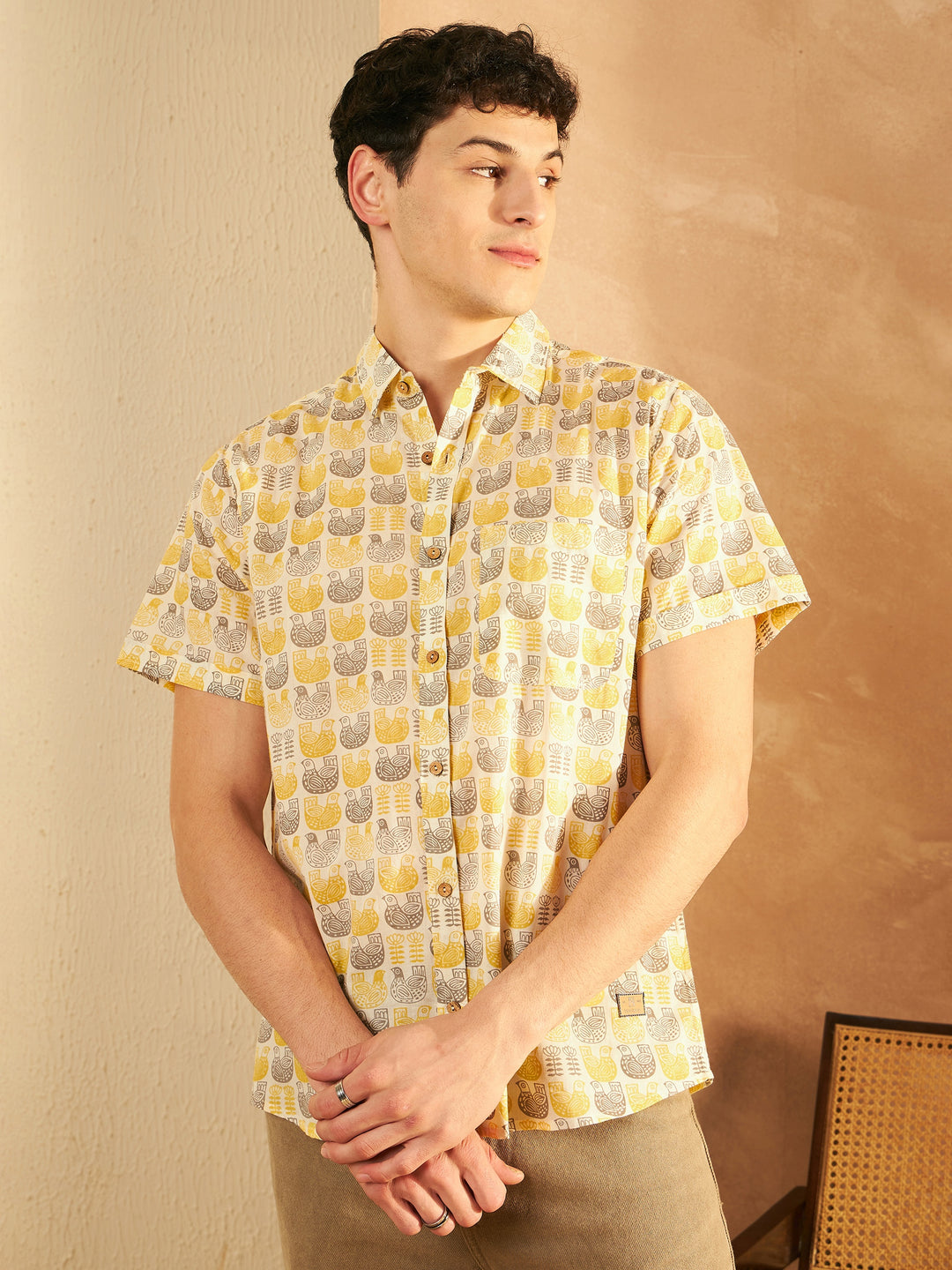 Off White & Yellow: Half Sleeves Block Printed Shirts