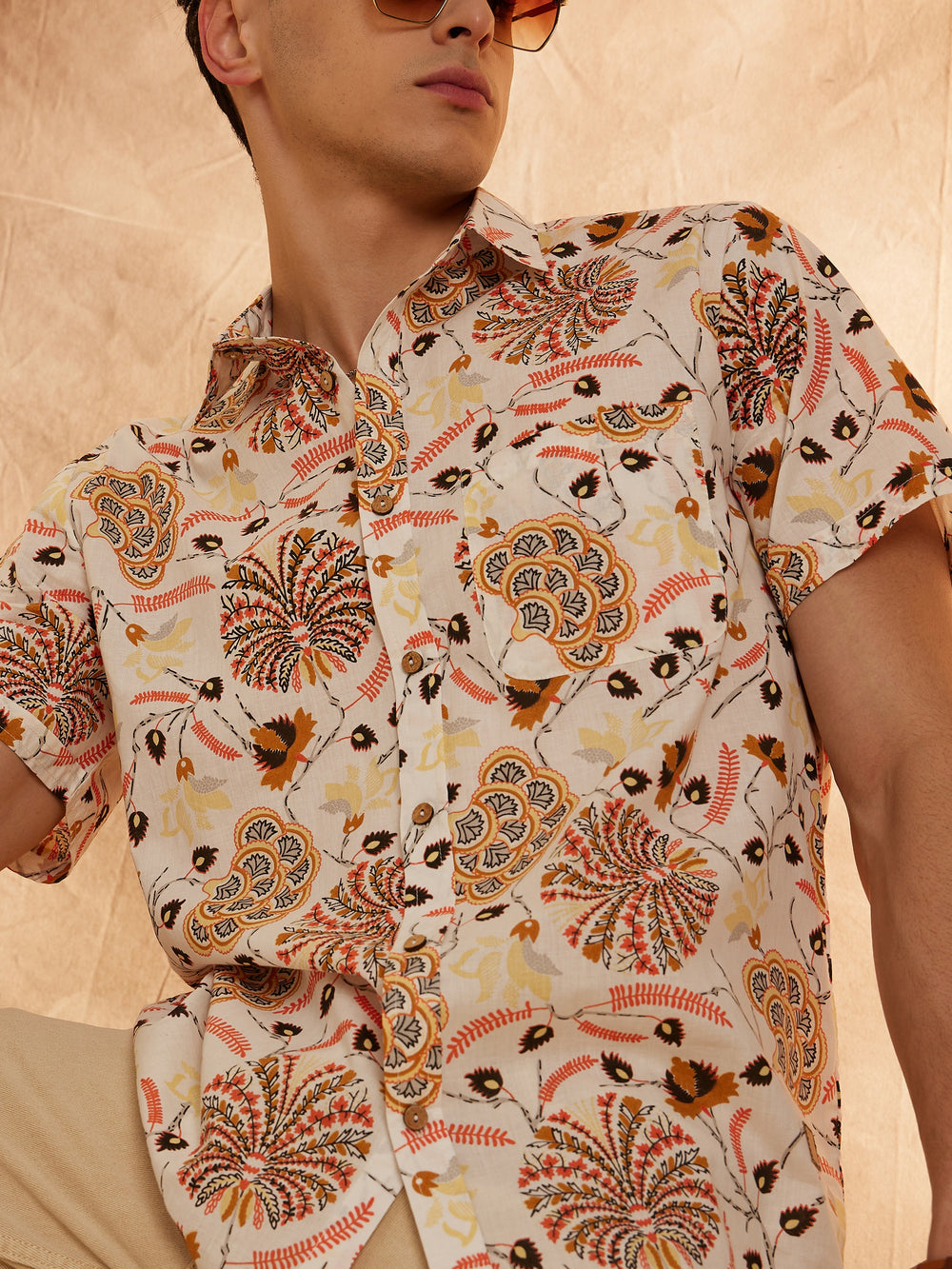 Cream-coloured ethnic motifs printed opaque Casual shirt ,has a spread collar, button placket, 1 patch pocket, short regular sleeves, curved hem