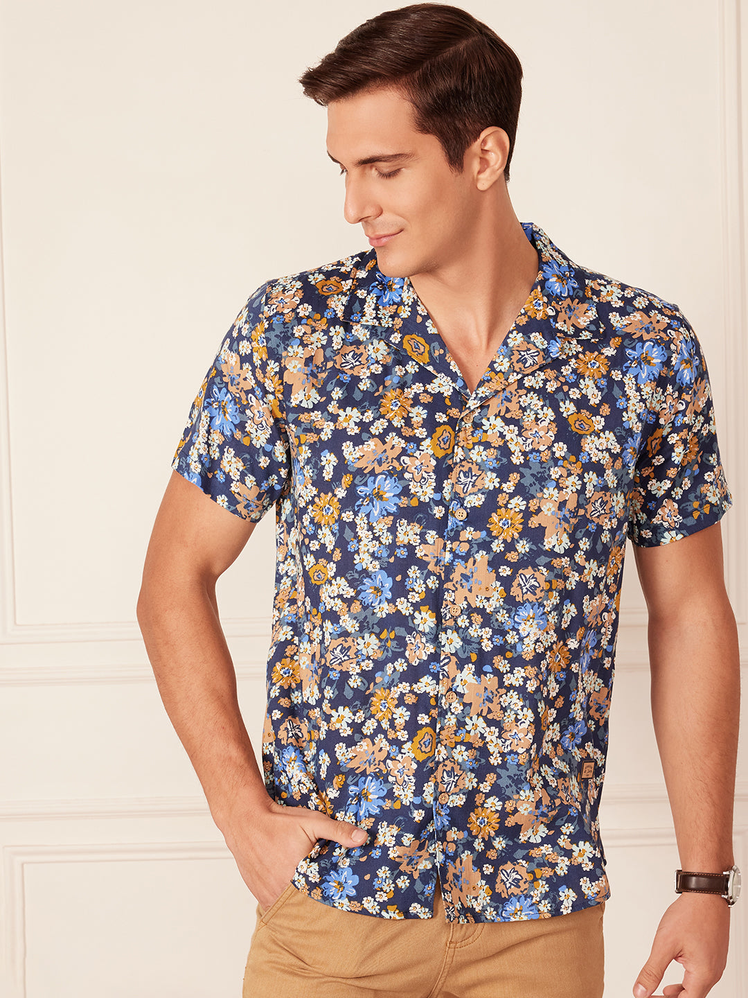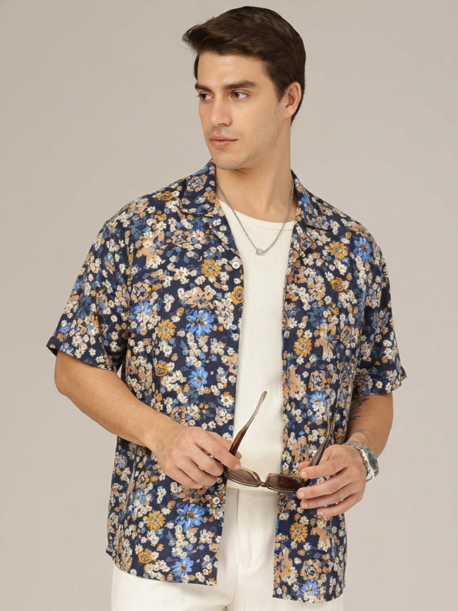 Navy blue floral printed opaque Casual shirt ,has a cuban collar, button placket, short regular sleeves, curved hem