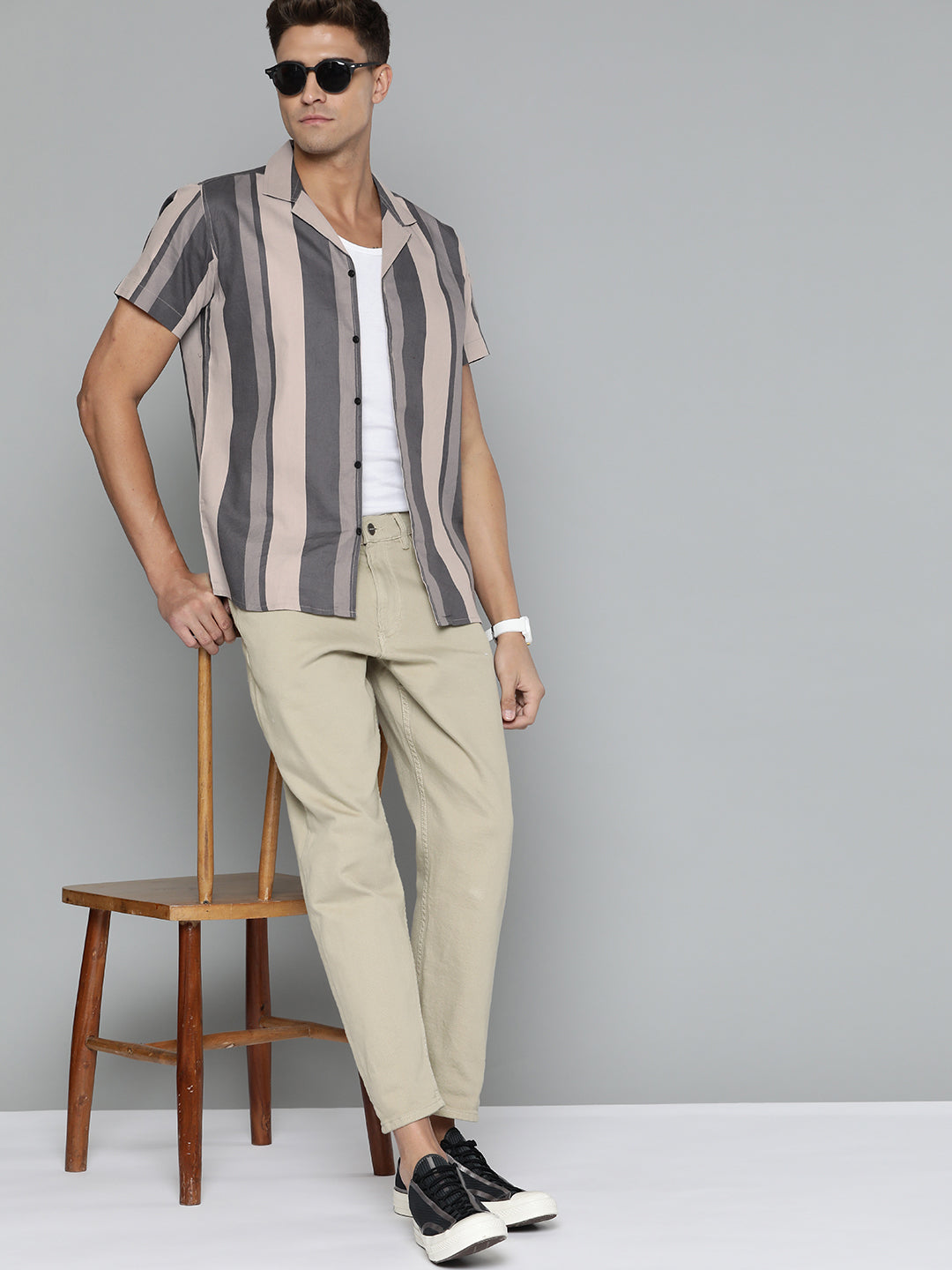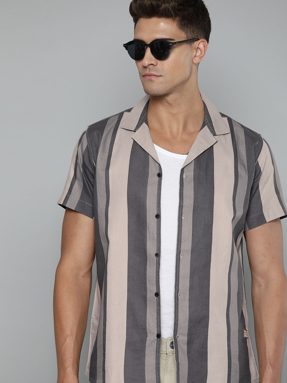 Beige vertical stripes striped opaque Casual shirt ,has a cuban collar, button placket, short regular sleeves, curved hem