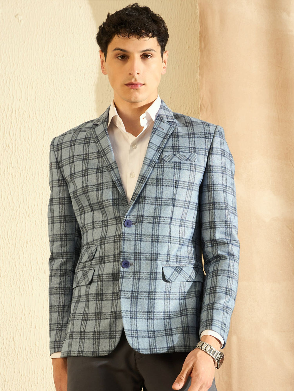 Light Blue checked regular-fit casual blazer, has a notched lapel, long sleeves, single-breasted with double button closure, two flap pockets, one welt pocket, and a double-vented back hem
