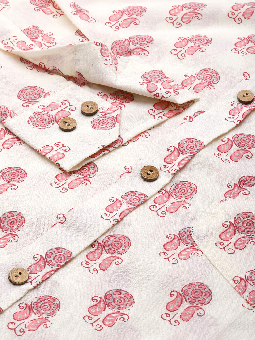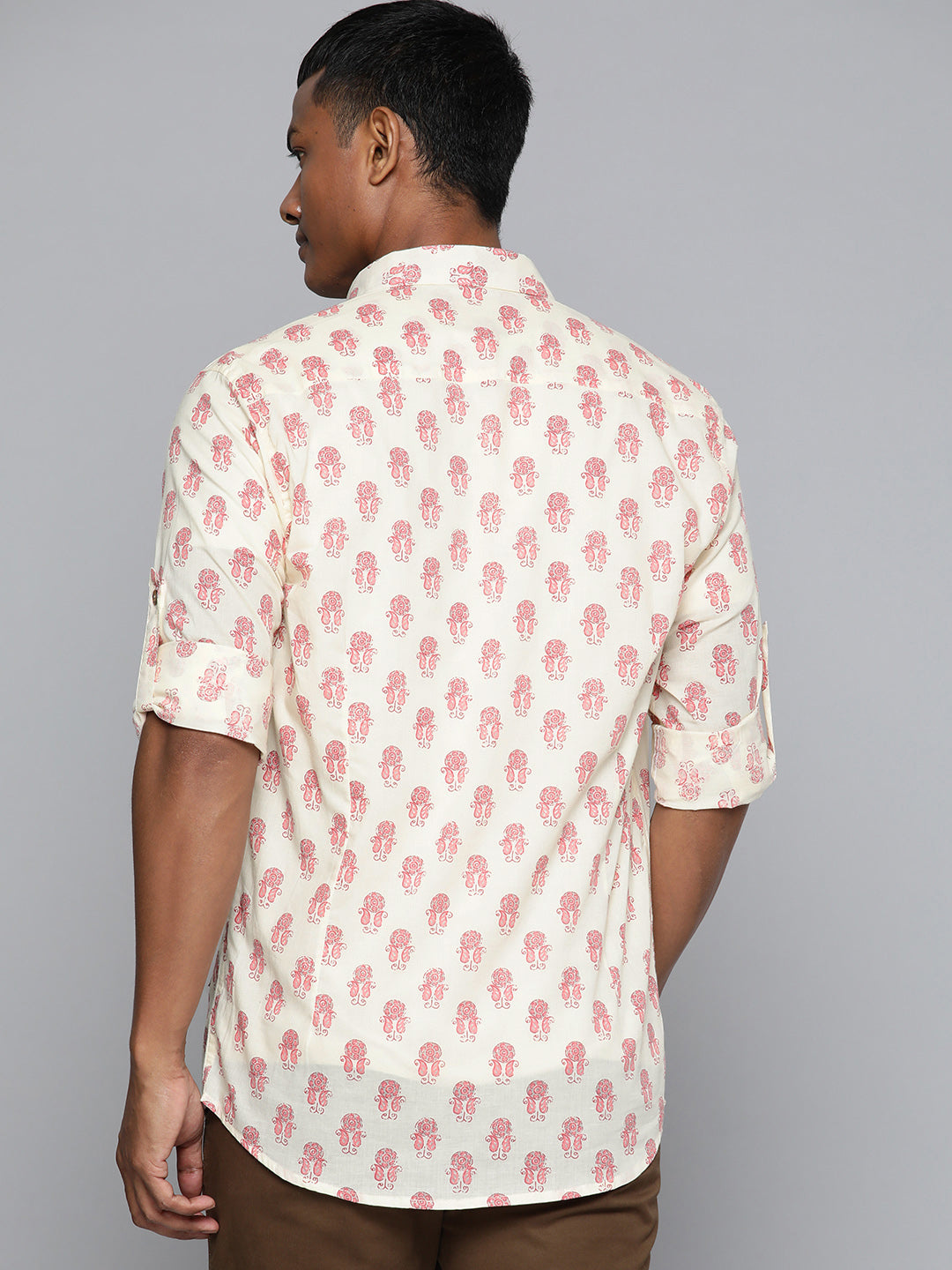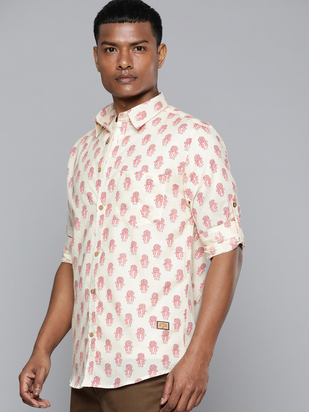 Cream-coloured ethnic motifs printed opaque Casual shirt ,has a spread collar, button placket, 1 patch pocket, long roll-up sleeves, curved hem