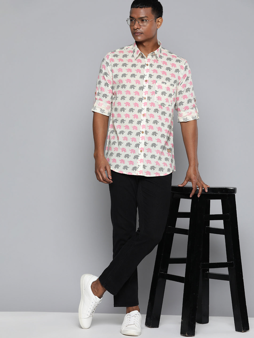 Cream-coloured abstract printed opaque Casual shirt ,has a spread collar, button placket, 1 patch pocket, long roll-up sleeves, curved hem