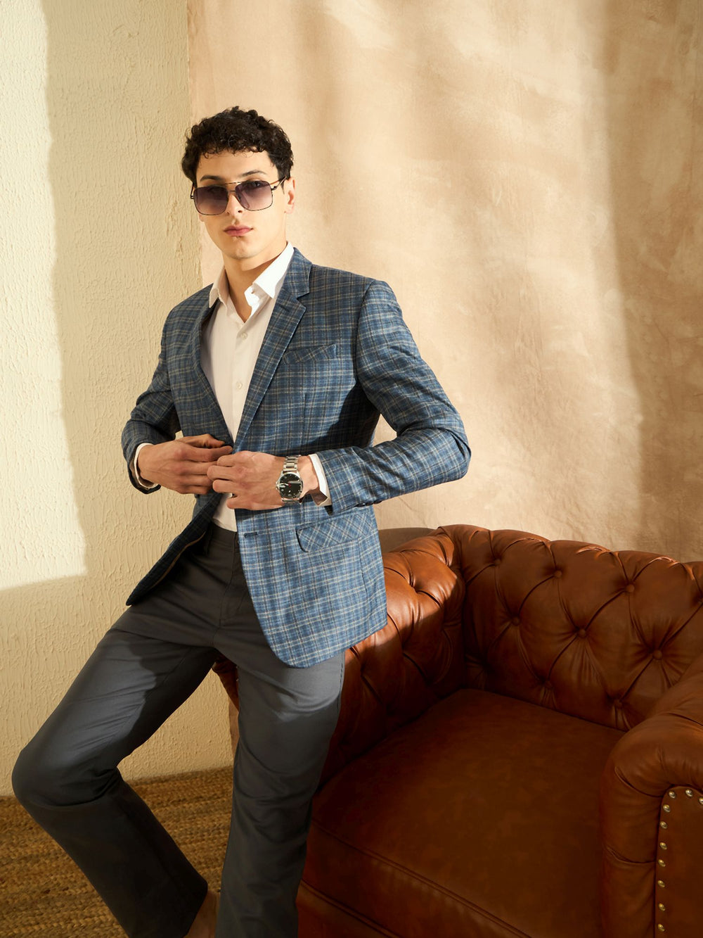 DENNISON Men Denim Blue Checked Single Breasted Blazer