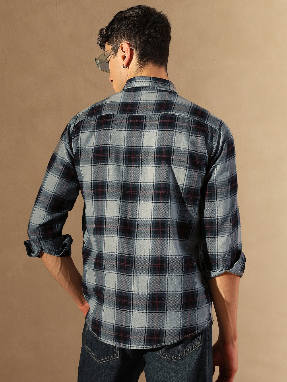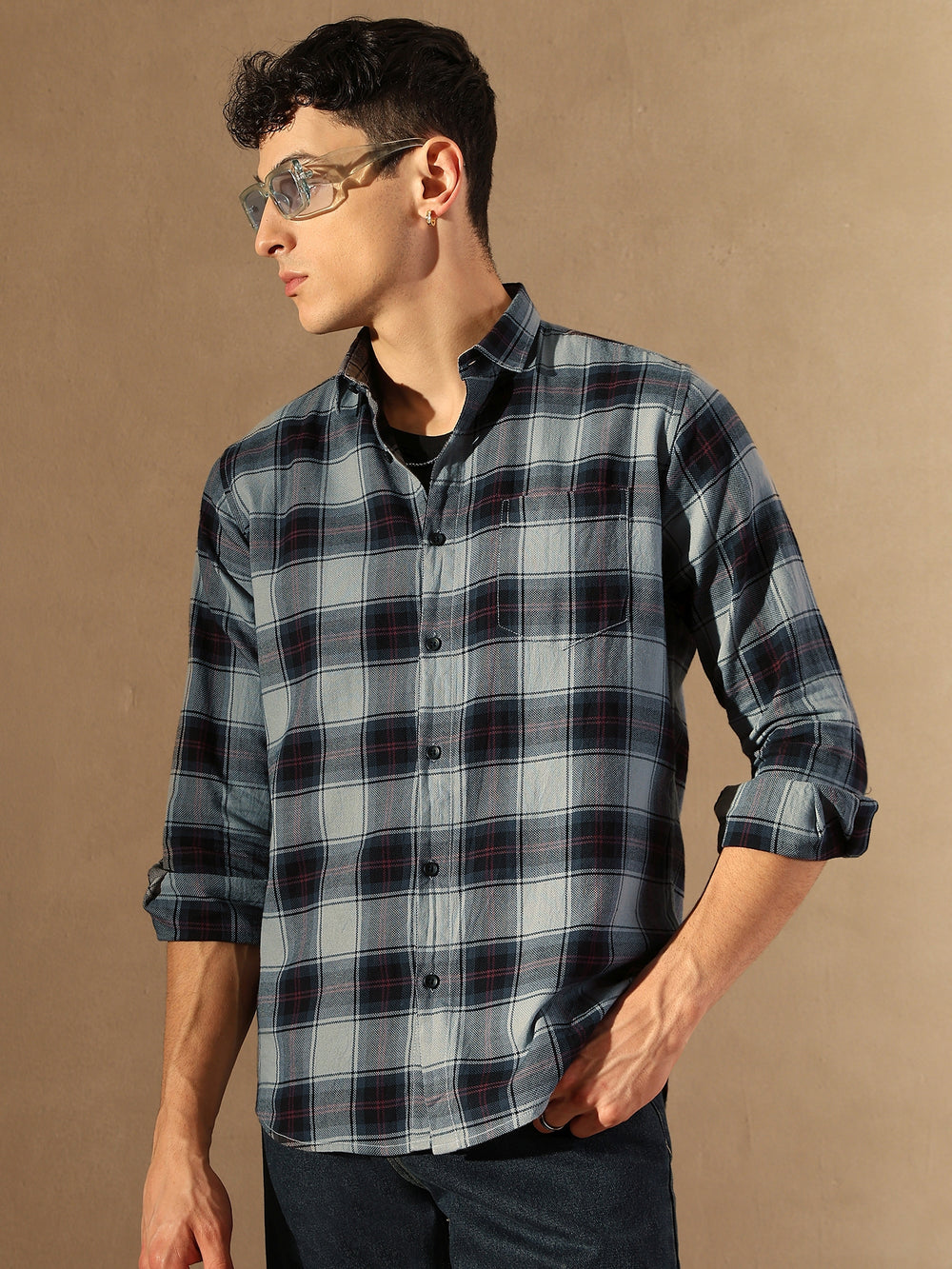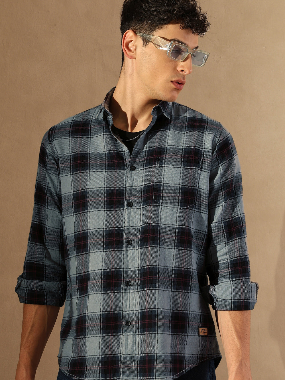 Grey & Black checks opaque Casual shirt ,has a spread collar, button placket, 1 patch pocket, long regular sleeves, curved hem