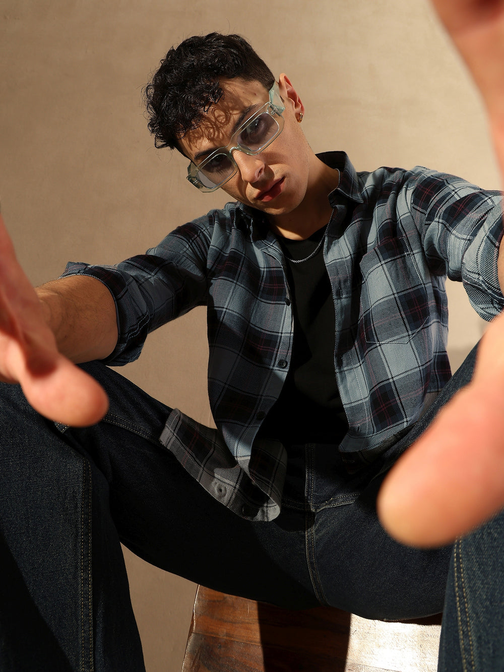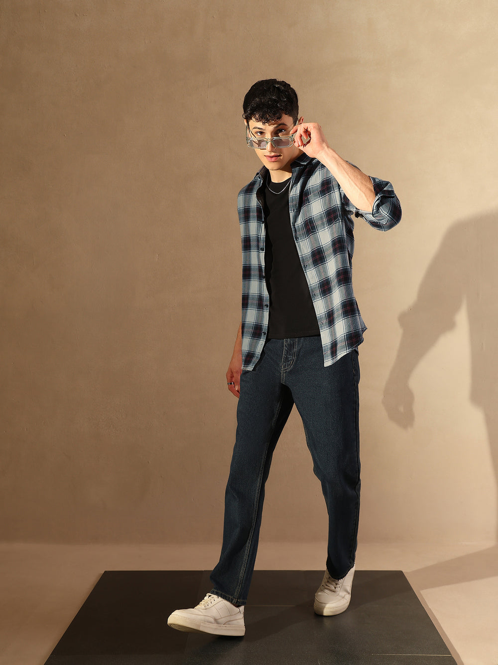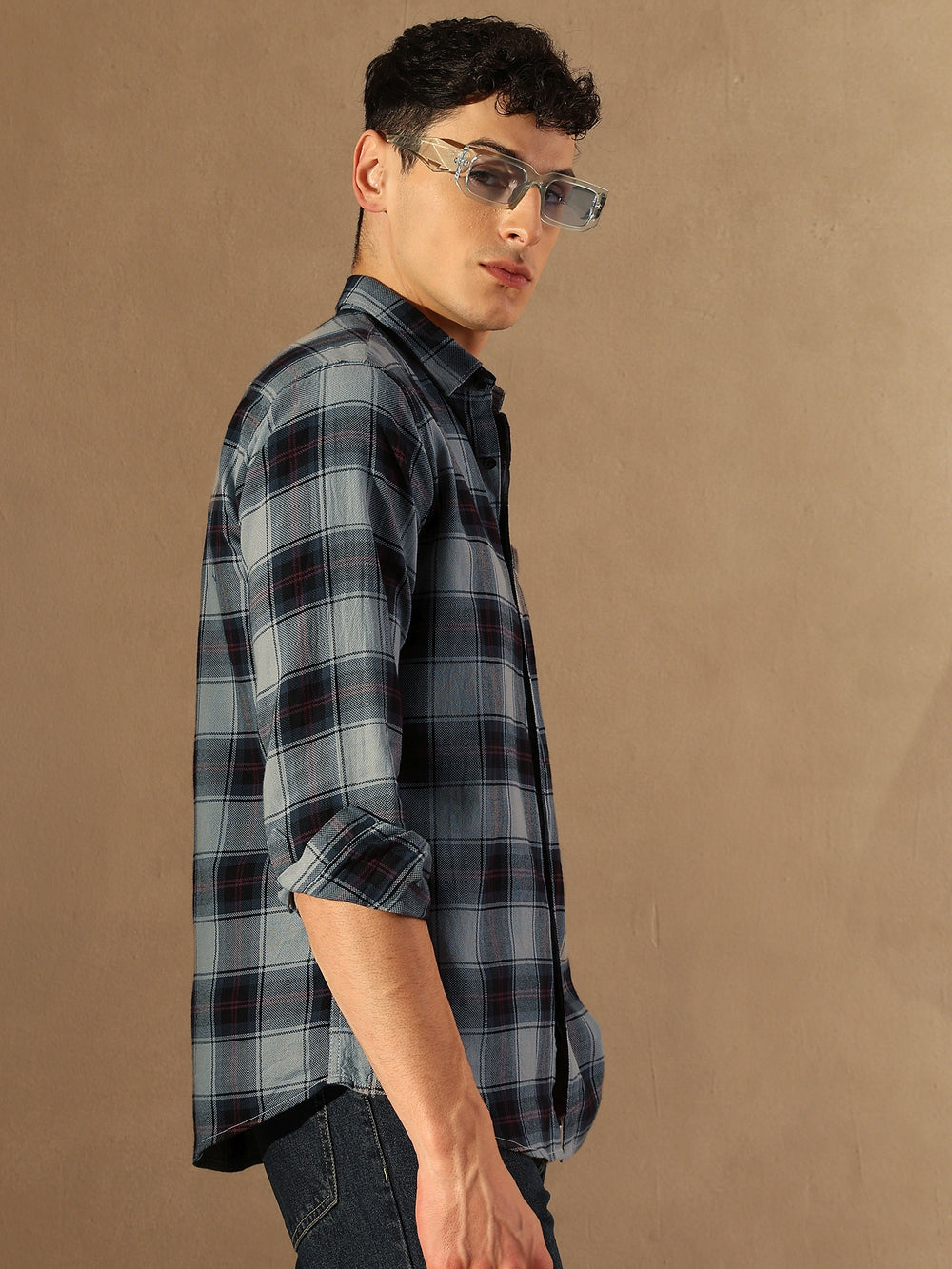 Grey & Black checks opaque Casual shirt ,has a spread collar, button placket, 1 patch pocket, long regular sleeves, curved hem