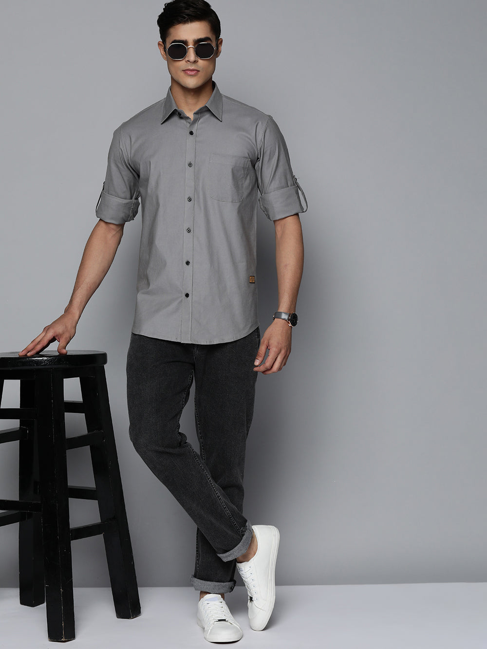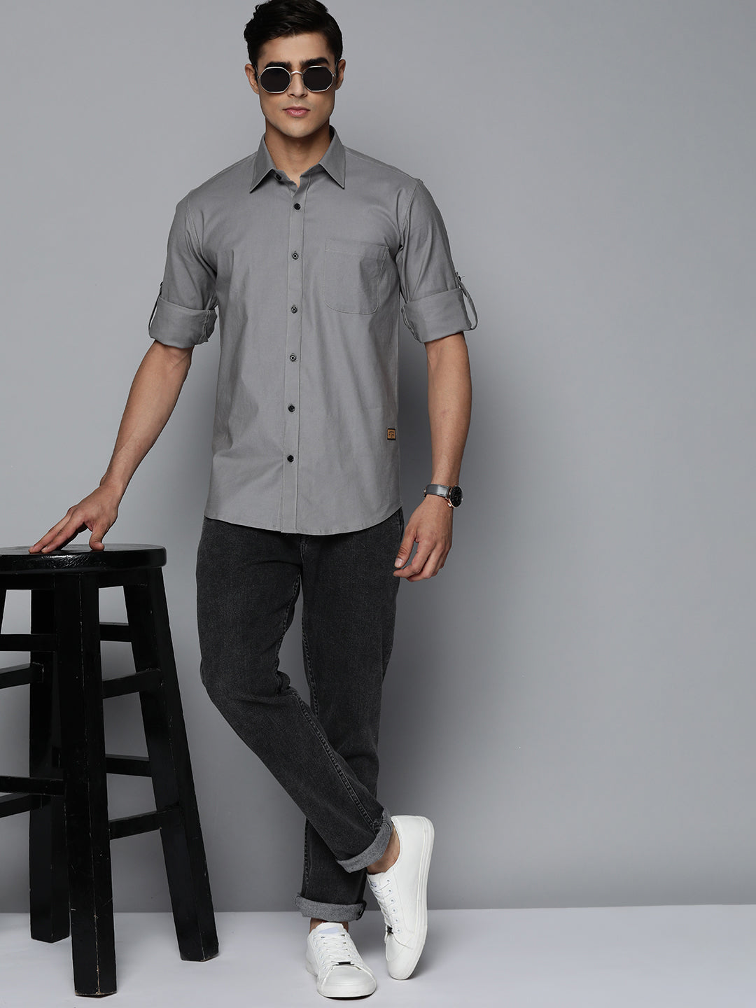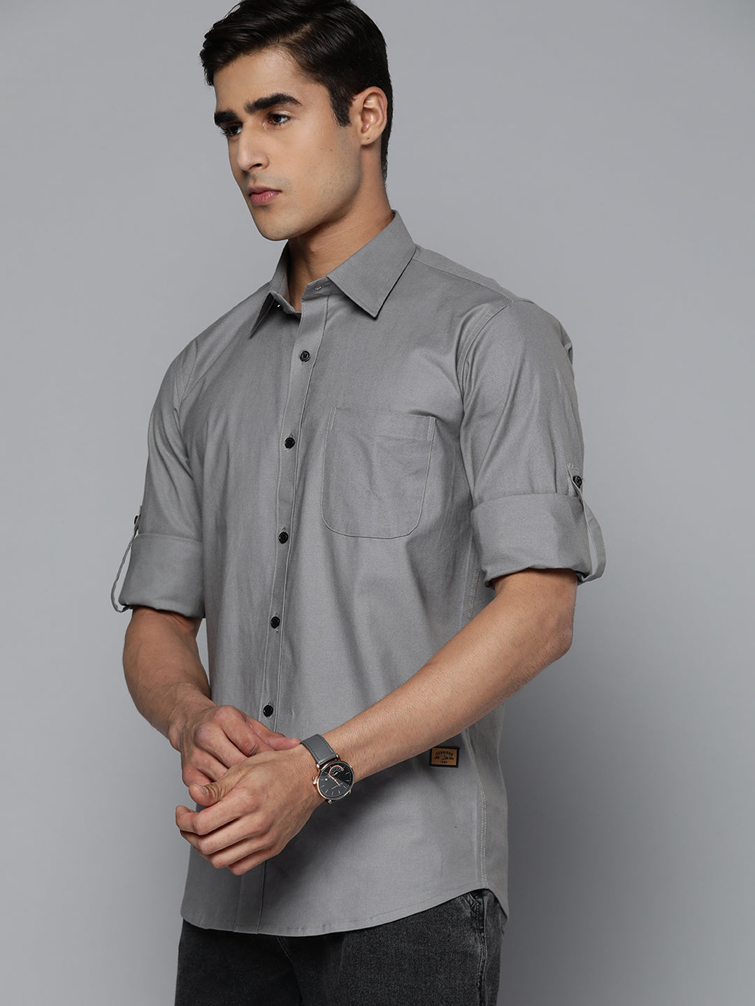 Grey solid opaque Casual shirt ,has a spread collar, button placket, 1 patch pocket, long roll-up sleeves, curved hem