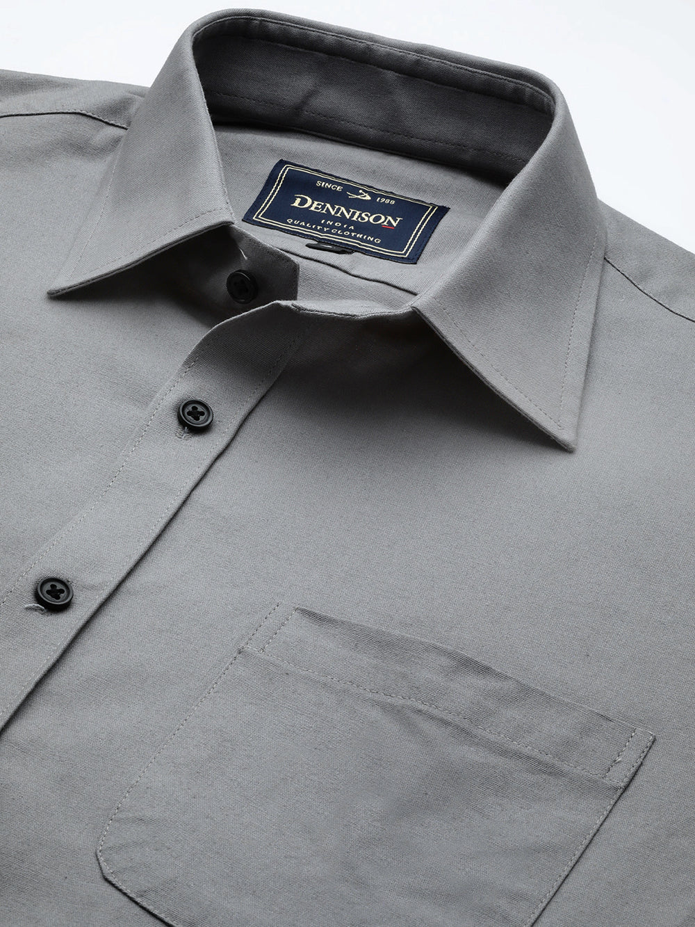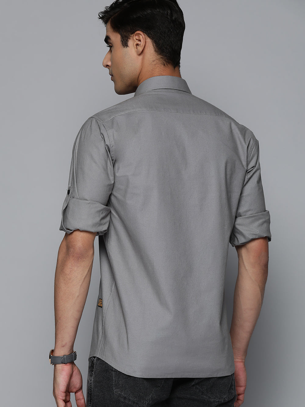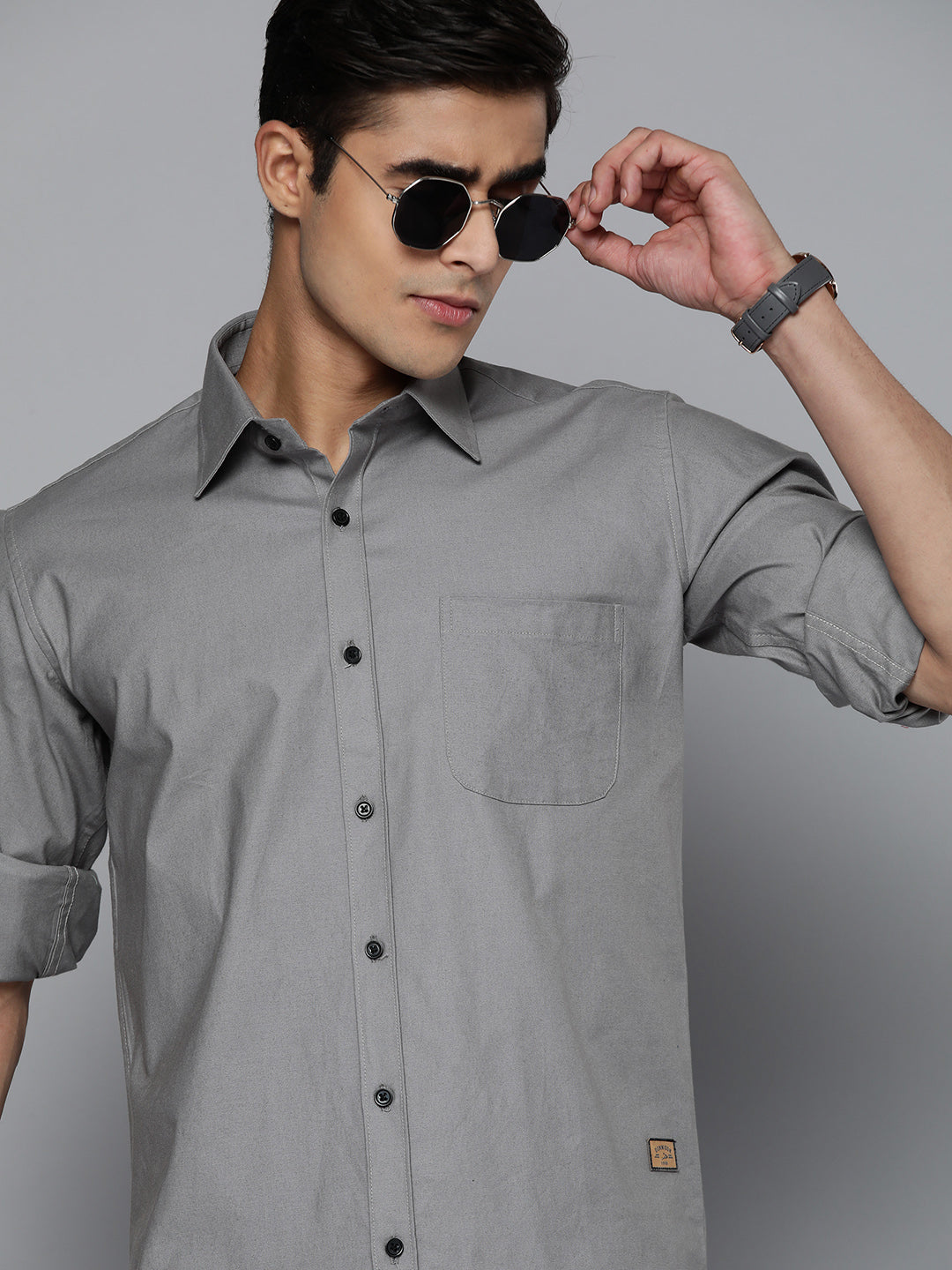 Grey solid opaque Casual shirt ,has a spread collar, button placket, 1 patch pocket, long roll-up sleeves, curved hem