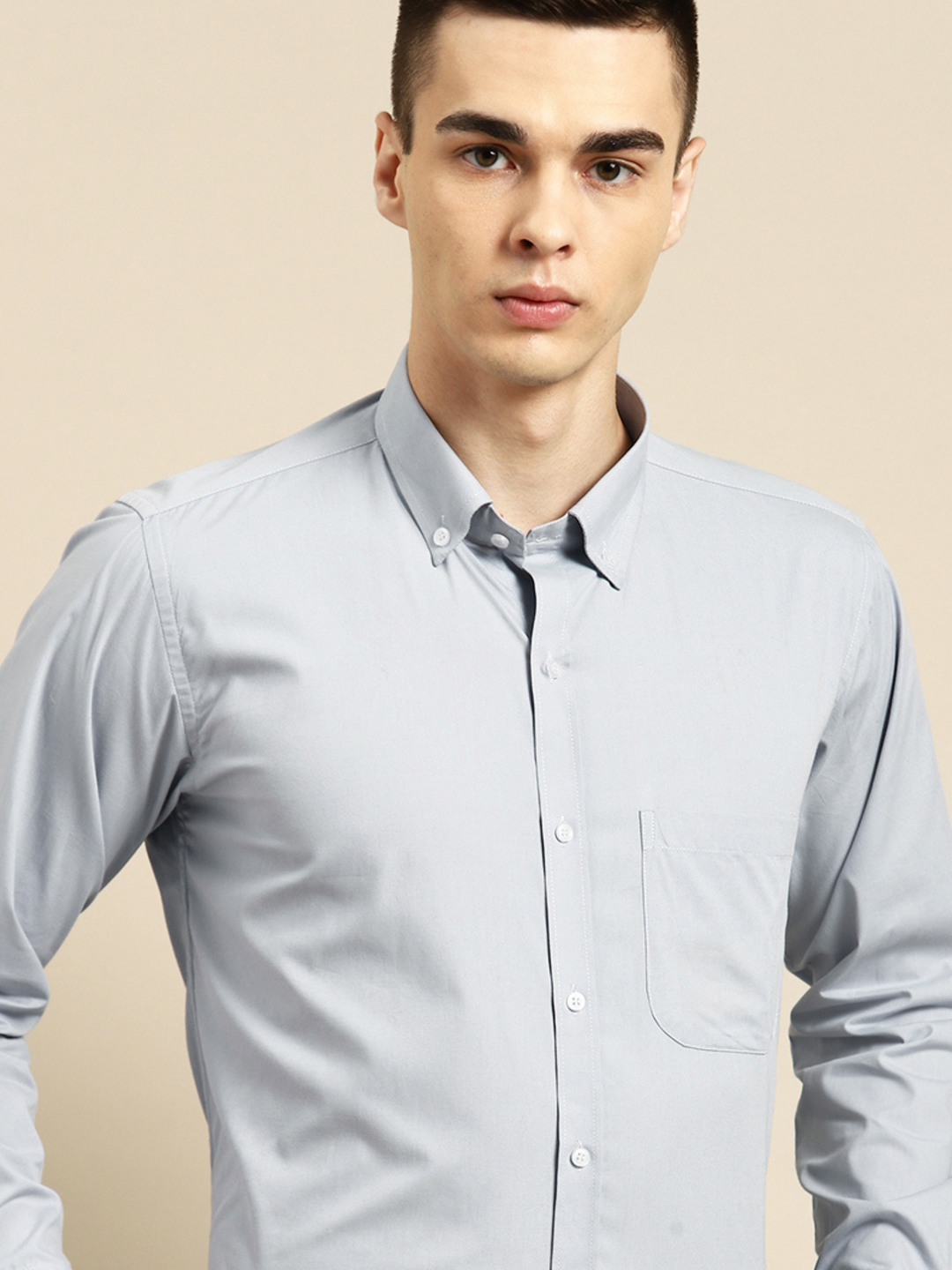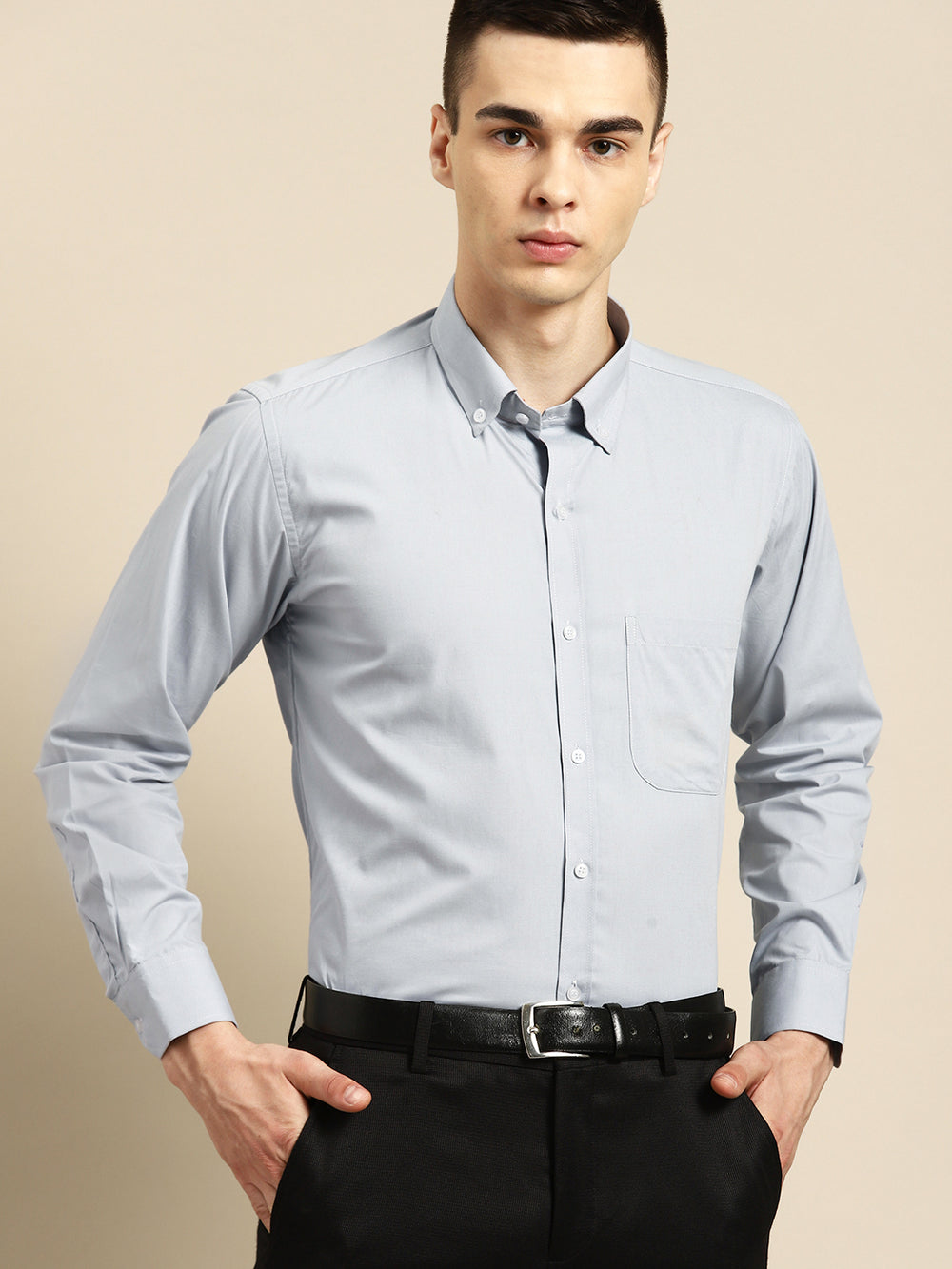 Grey solid opaque Formal shirt ,has a button-down collar, button placket, 1 patch pocket, long regular sleeves, curved hem