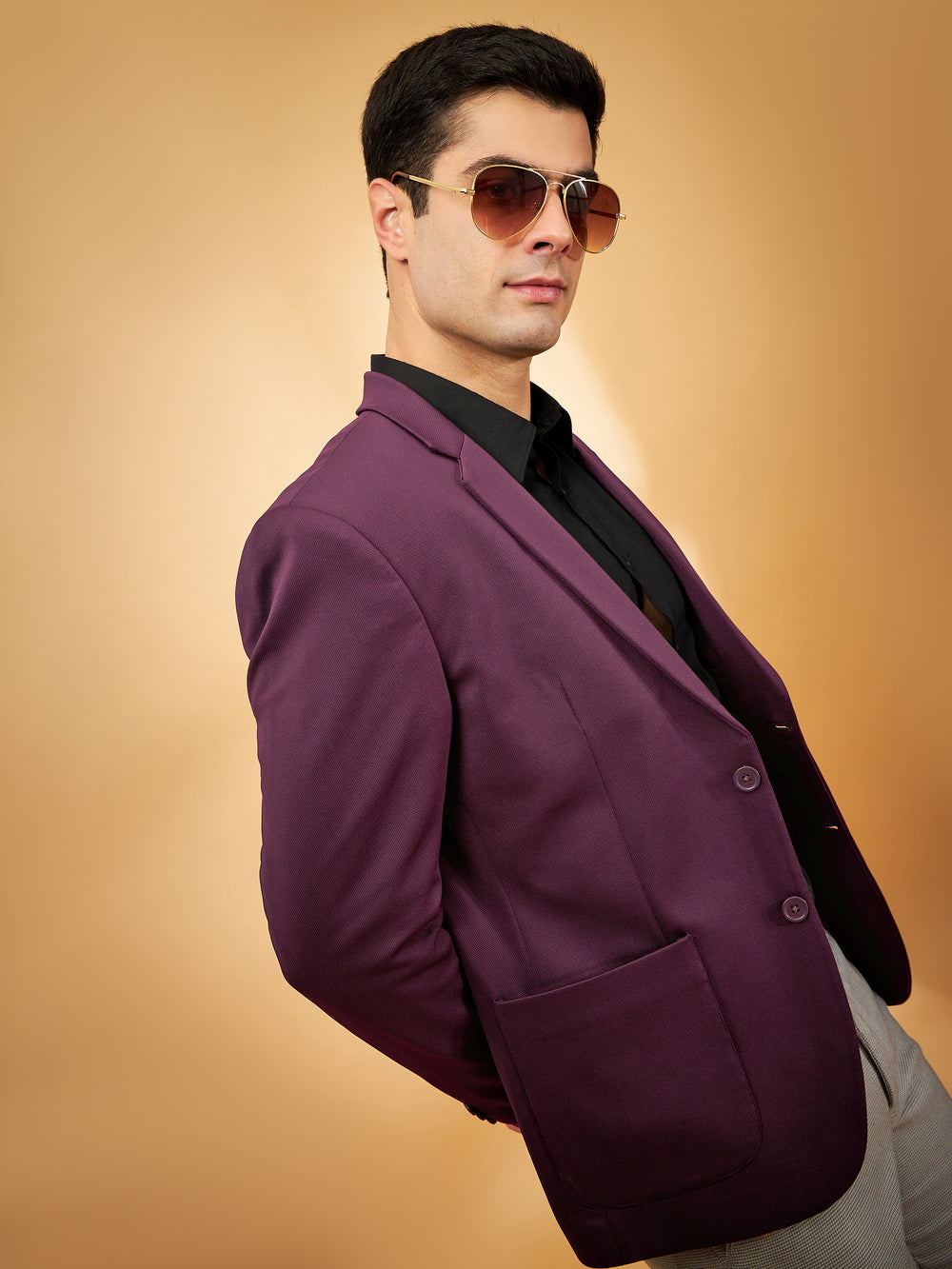 Maroon solid regular-fit casual blazer, has a notched lapel, long sleeves, single-breasted with double button closure, two flap pockets, one welt pocket and a double-vented back hem