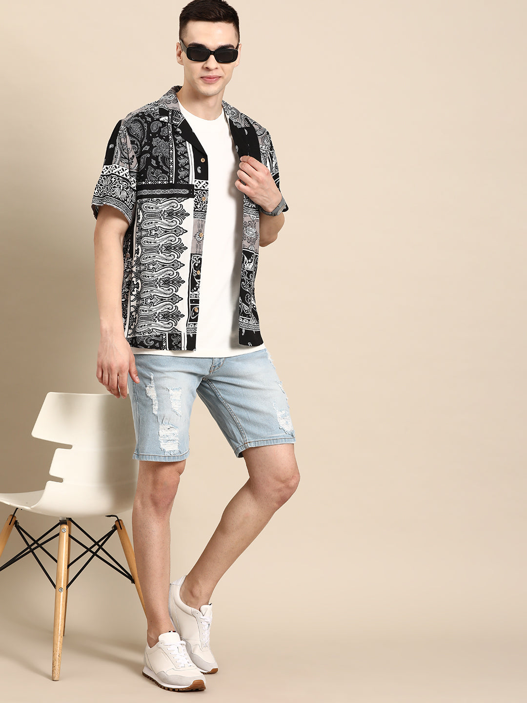 White ethnic motifs printed opaque Casual shirt ,has a cuban collar, button placket, short regular sleeves, curved hem