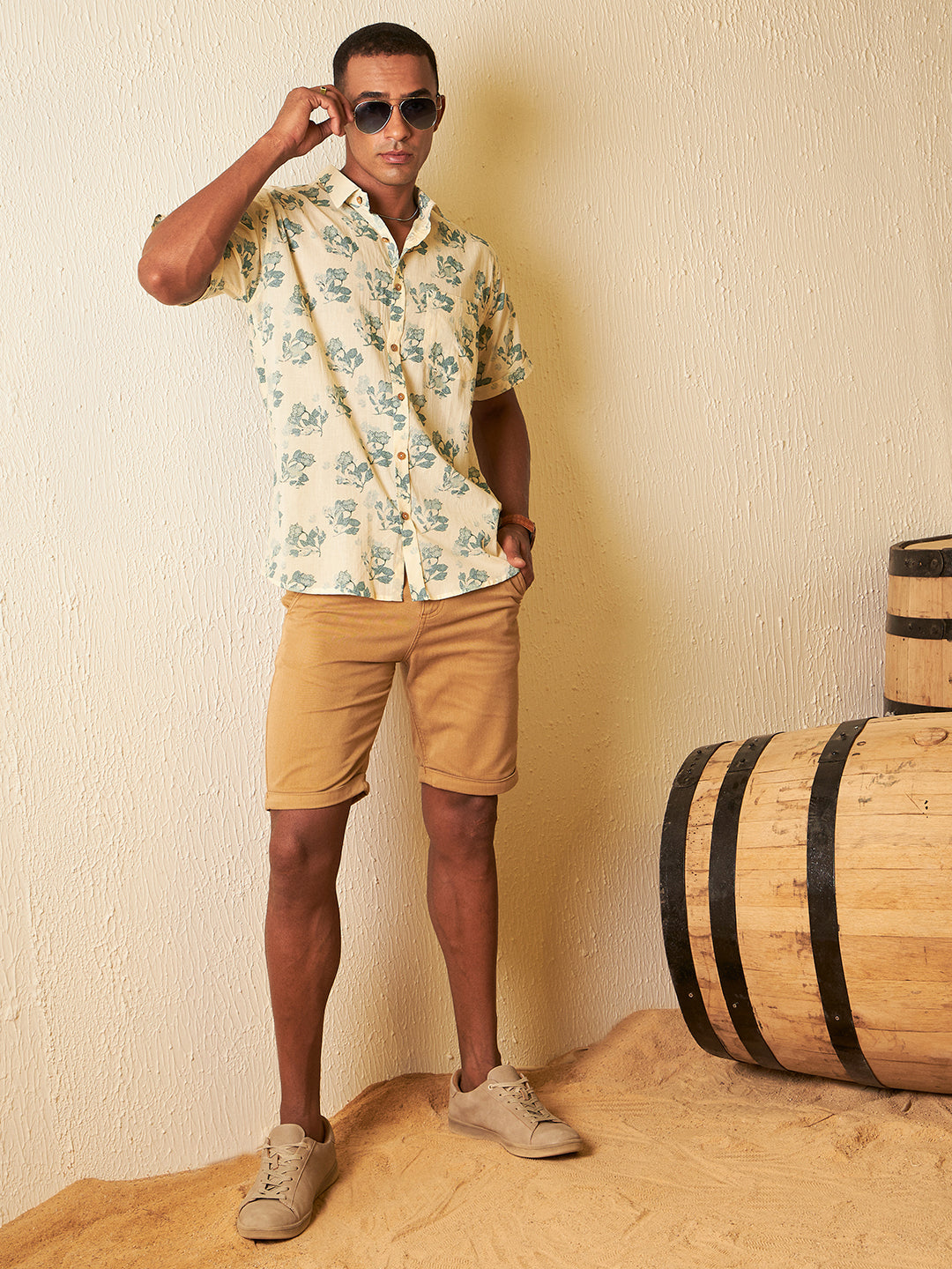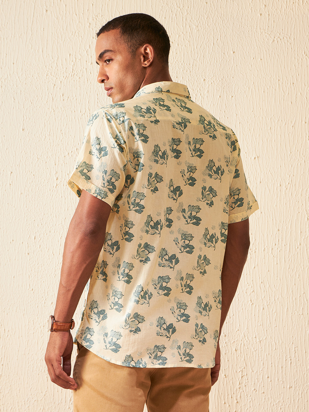 Beige floral printed opaque Casual shirt ,has a spread collar, button placket, 1 patch pocket, short regular sleeves, curved hem