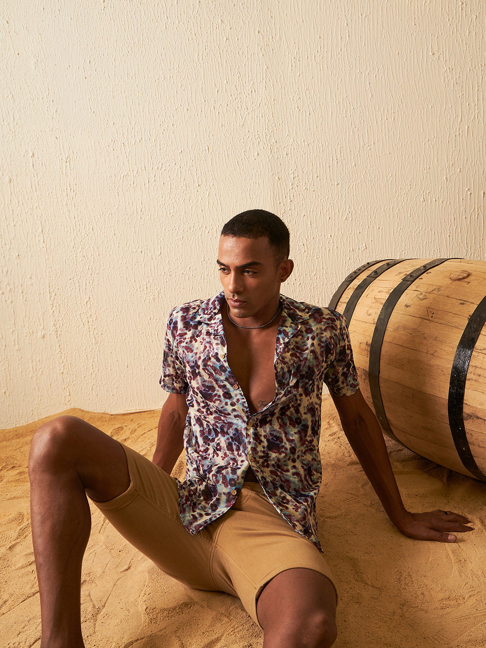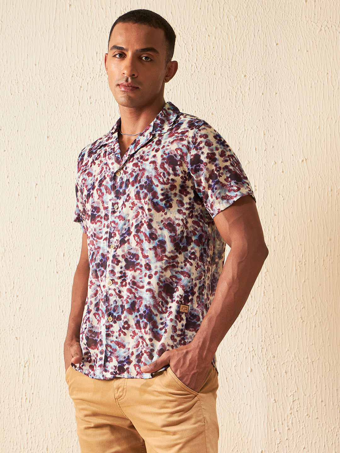 Multicoloured abstract printed opaque Casual shirt ,has a cuban collar, button placket, short regular sleeves, curved hem