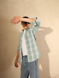 White & Brown checks opaque Casual shirt ,has a spread collar, button placket, 1 patch pocket, long regular sleeves, curved hem