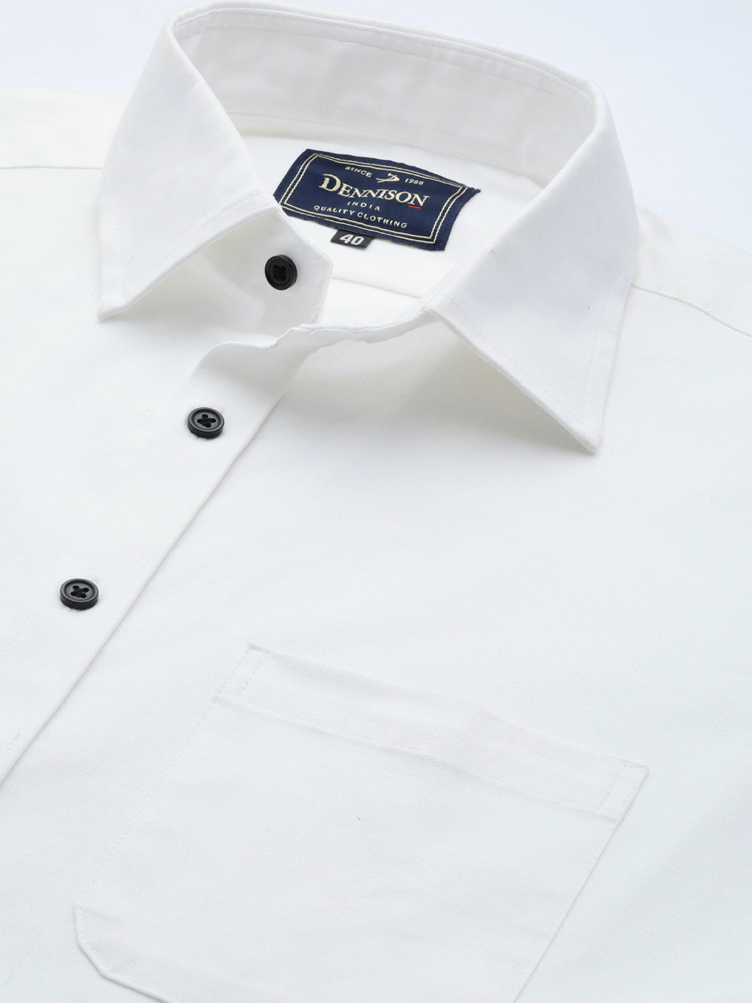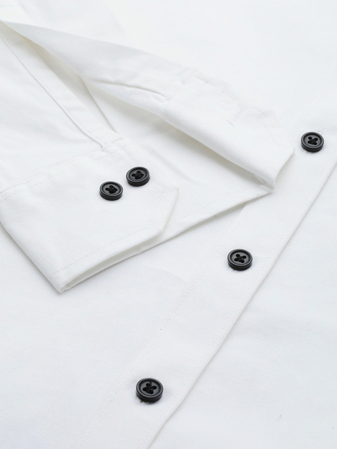 White solid opaque Casual shirt ,has a spread collar, button placket, 1 patch pocket, long roll-up sleeves, curved hem