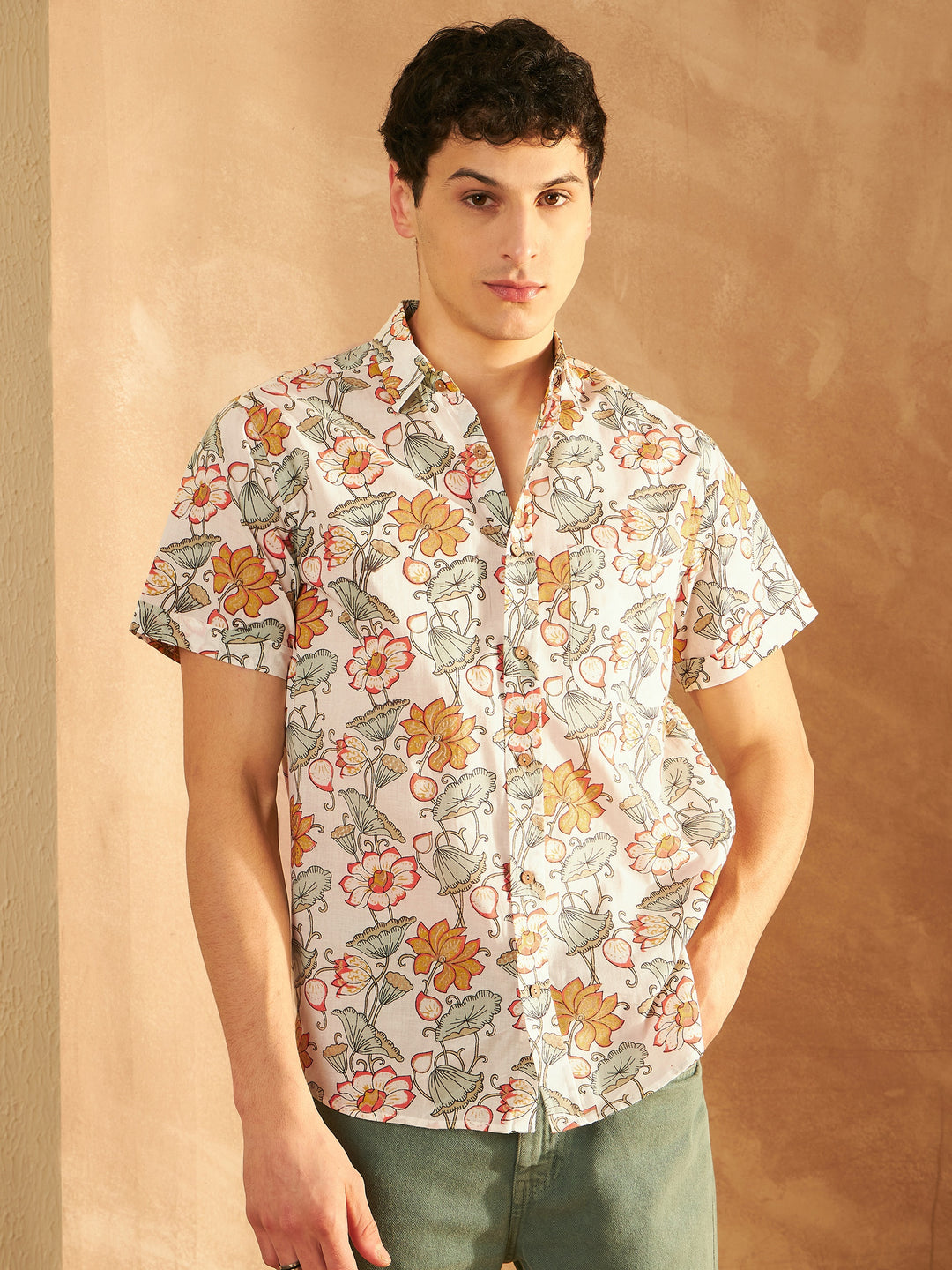 Cream-coloured and mustard floral printed opaque casual shirt ,has a spread collar, button placket, 1 patch pocket, short regular sleeves, curved hem