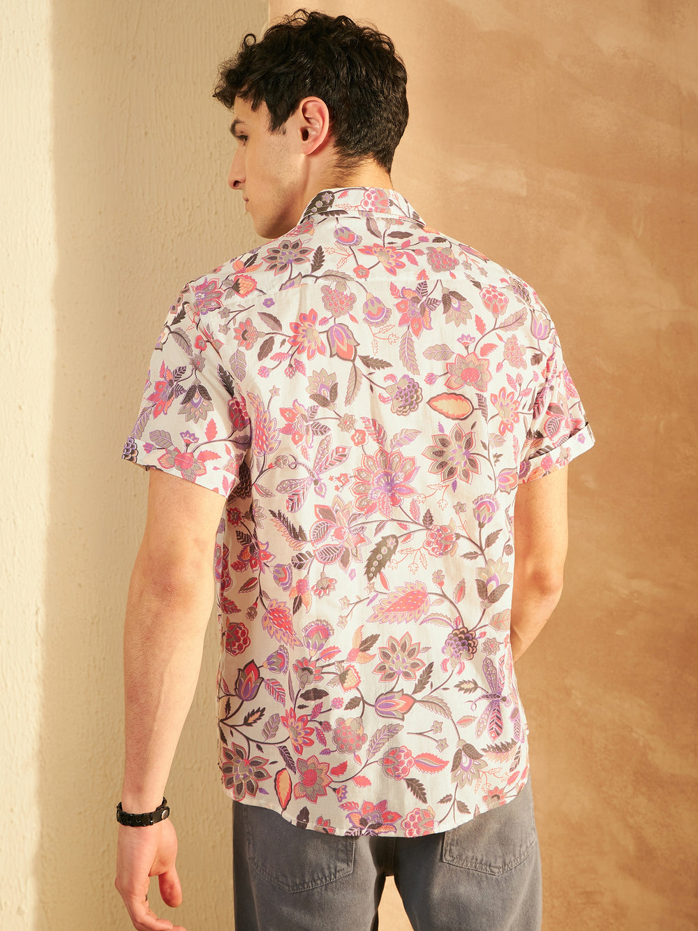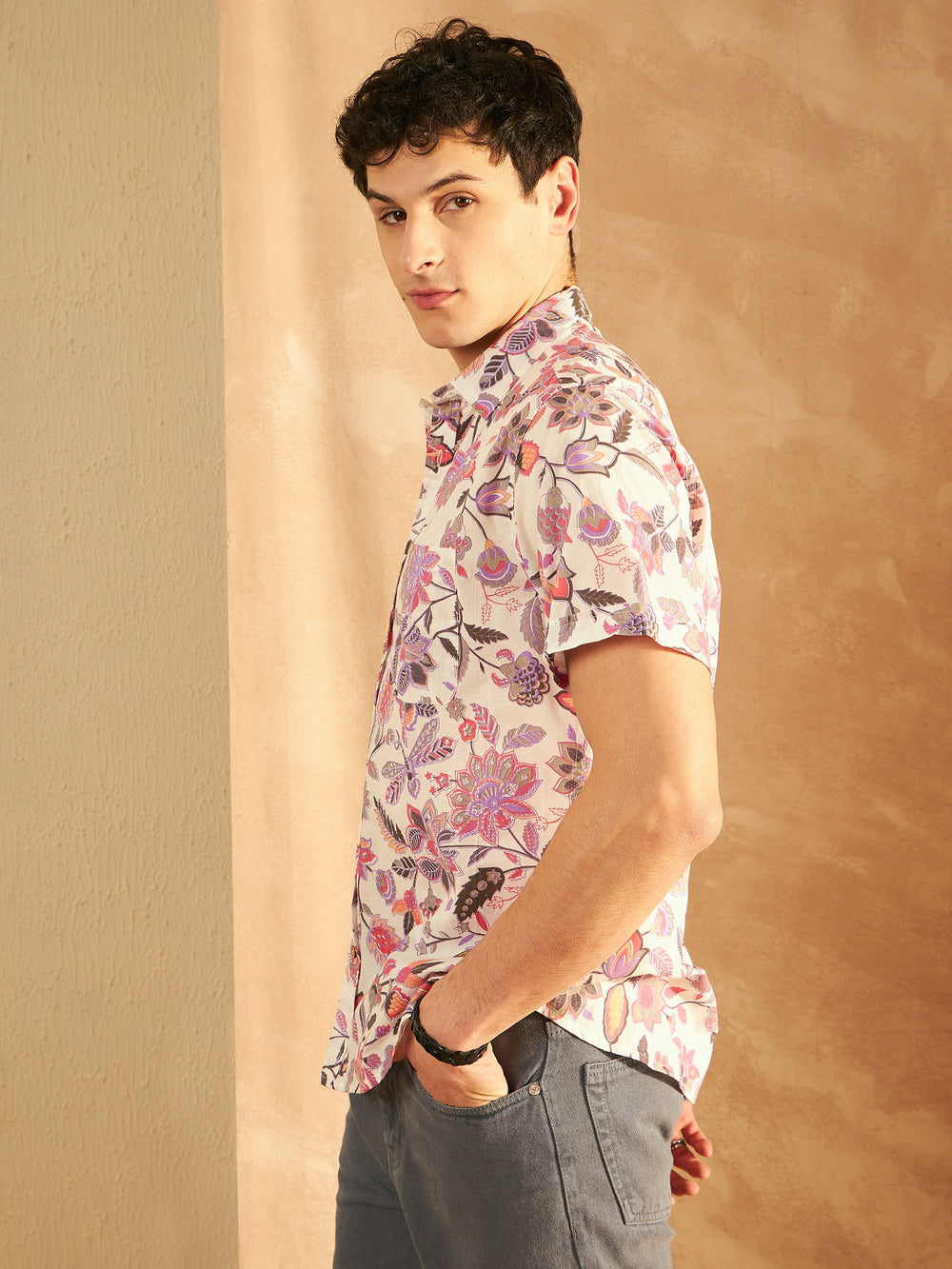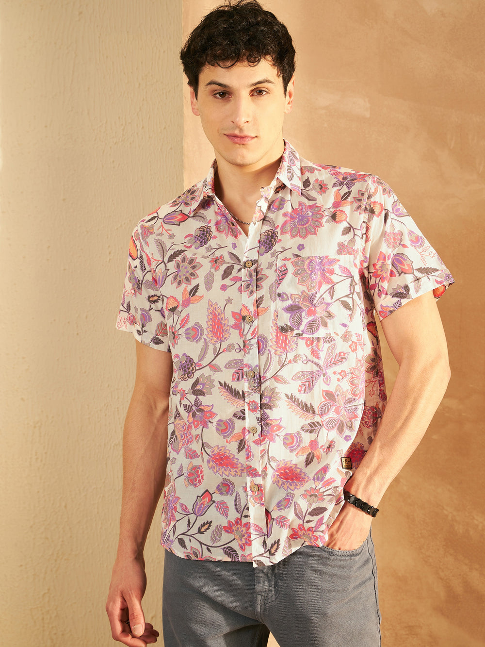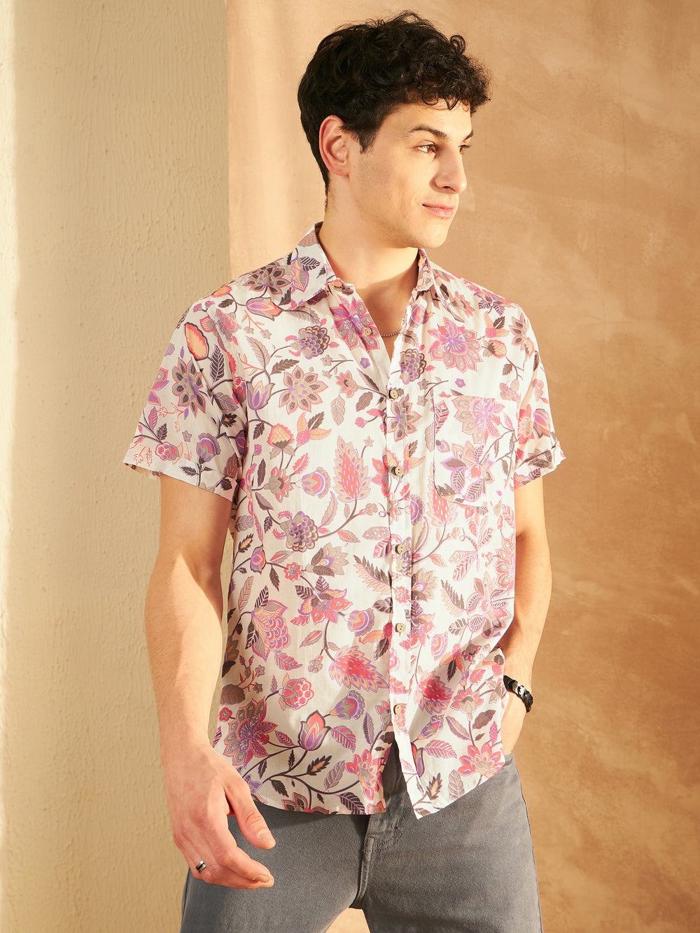 Cream-coloured and pink floral printed opaque casual shirt ,has a spread collar, button placket, 1 patch pocket, short regular sleeves, curved hem