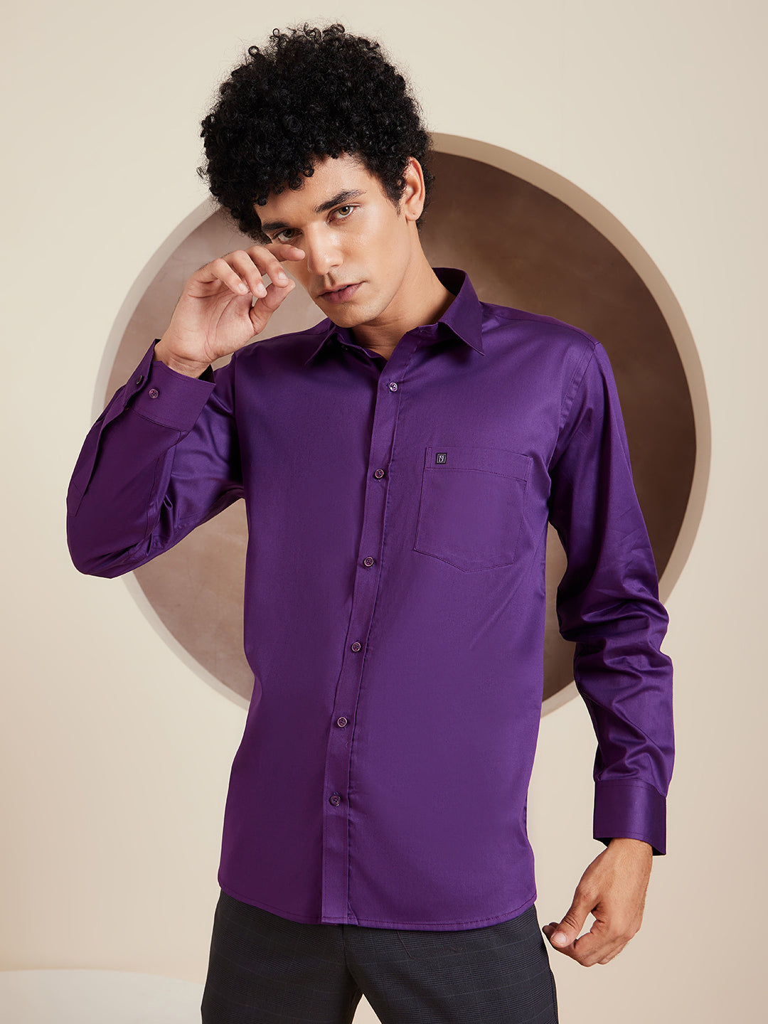 Purple brand logo printed opaque casual shirt, has a spread collar, button placket, 1 patch pocket, long regular sleeves, curved hem