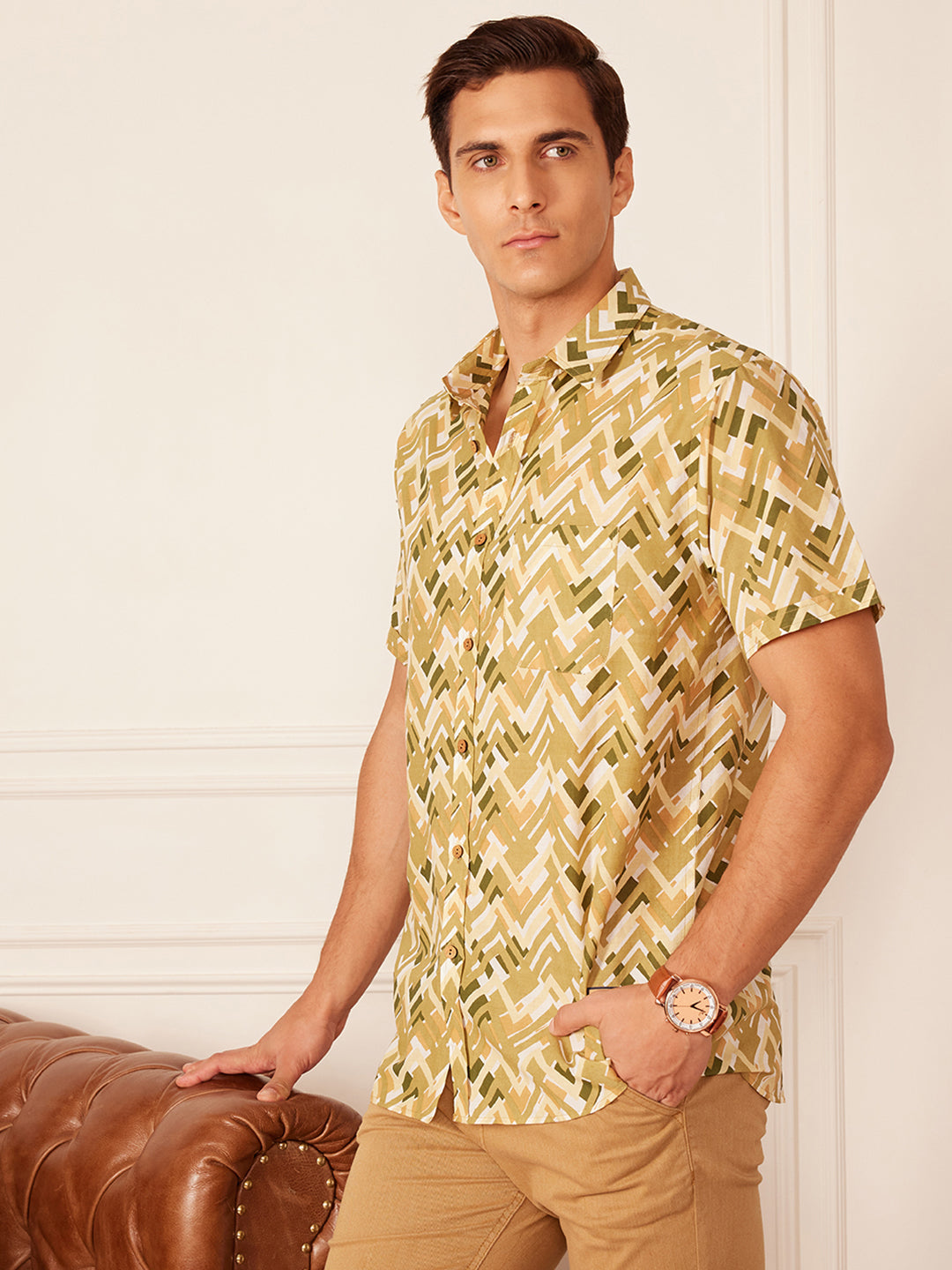 Beige & yellow abstract printed opaque Casual shirt, has a spread collar, button placket, 1 patch pocket, short regular sleeves, curved hem