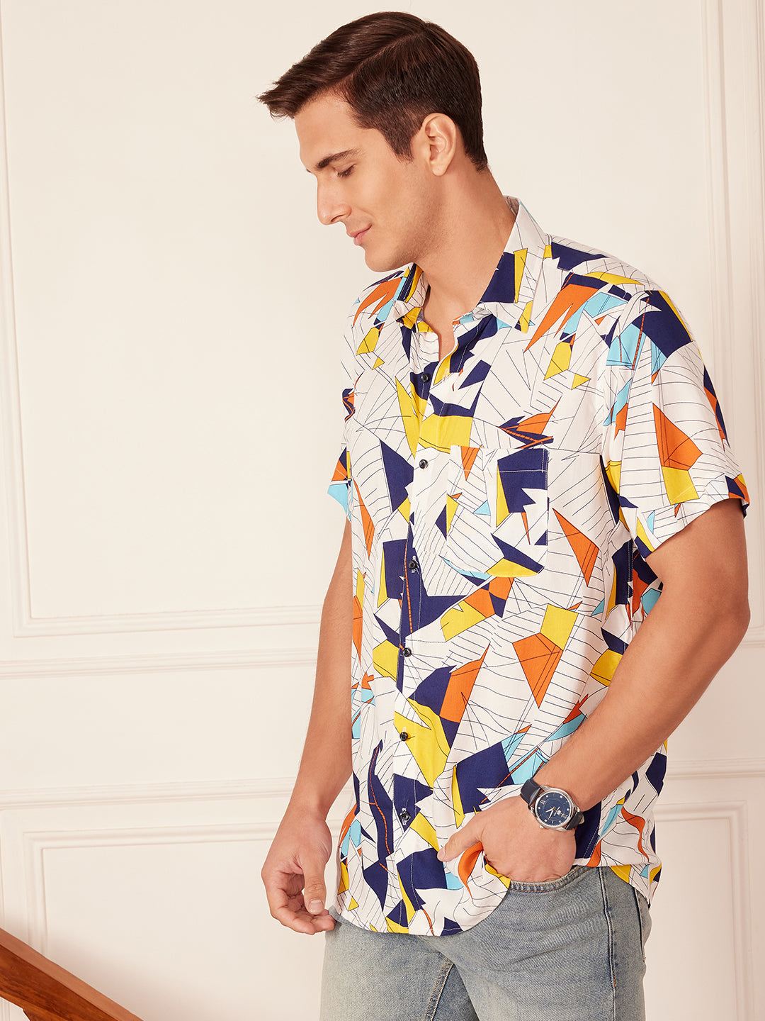 White, yellow & blue conversational printed opaque Casual shirt ,has a spread collar, button placket, 1 patch pocket, short regular sleeves, curved hem