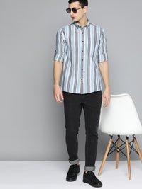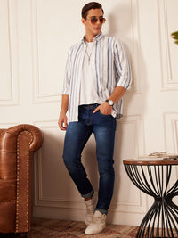 White: Full Sleeve Button-Down Collar Striped Shirt