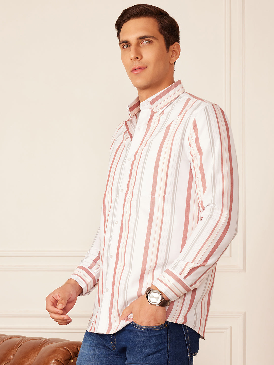 White vertical stripes striped opaque casual shirt ,has a button-down collar, button placket, 1 patch pocket, long regular sleeves, curved hem