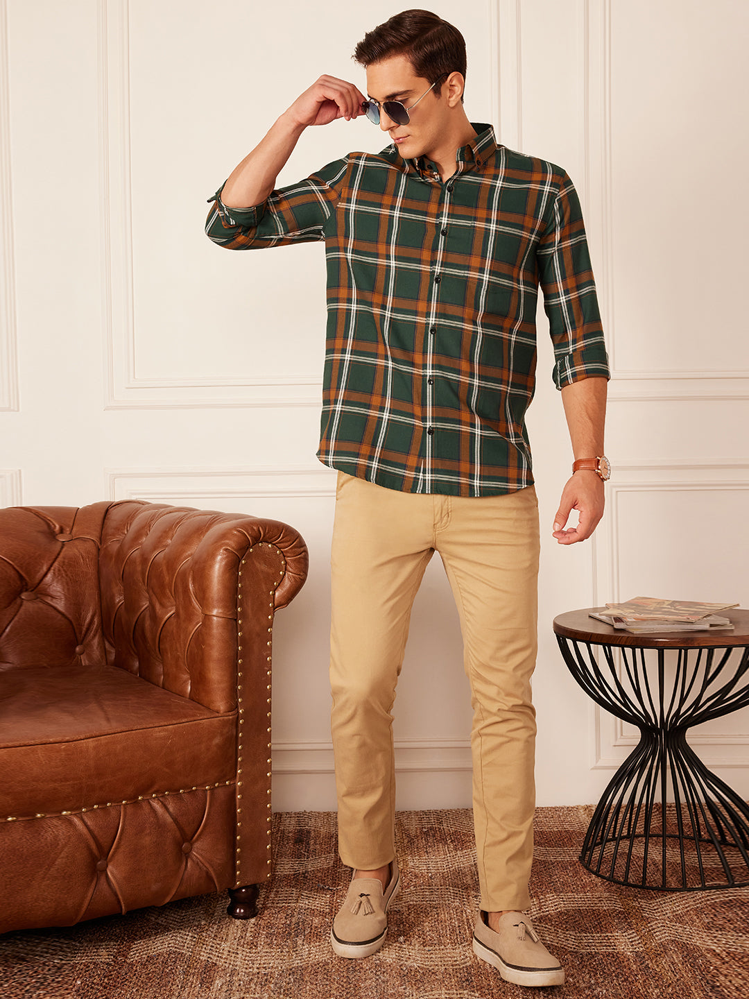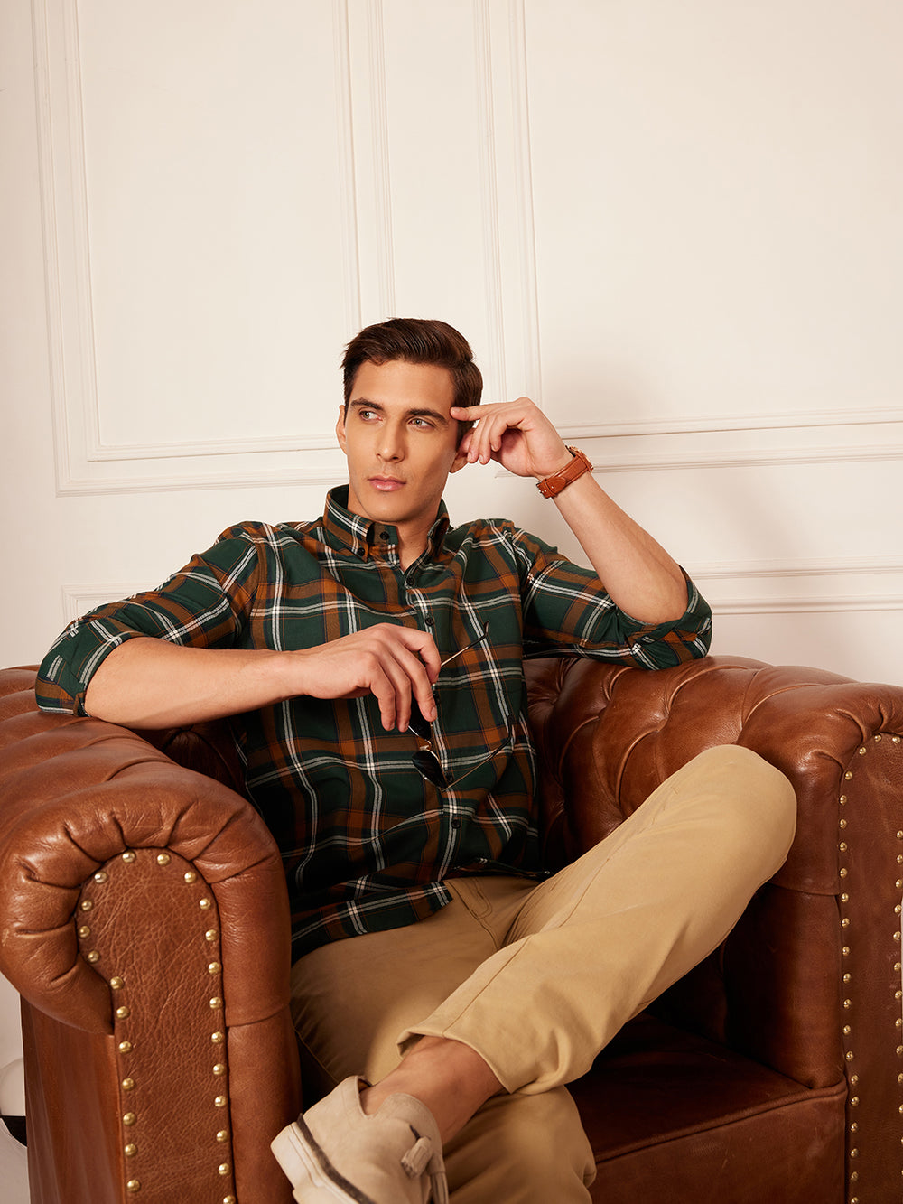 Green tartan checks checked opaque Casual shirt ,has a button-down collar, button placket, 1 patch pocket, long regular sleeves, curved hem