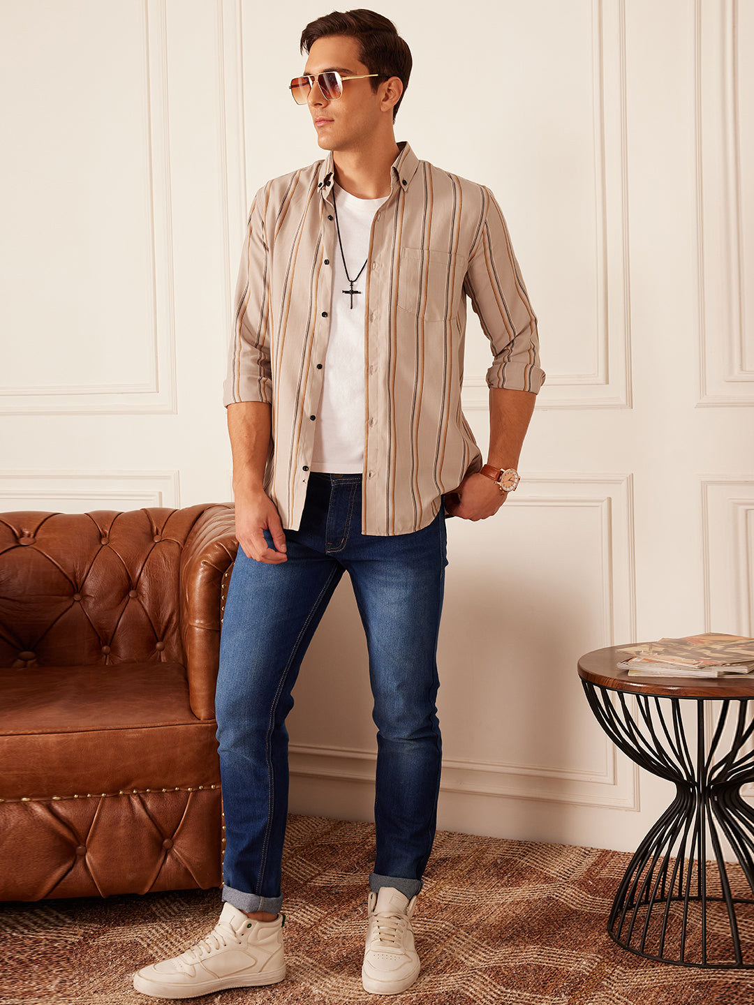Beige: Full Sleeve Button-Down Collar Striped Shirt