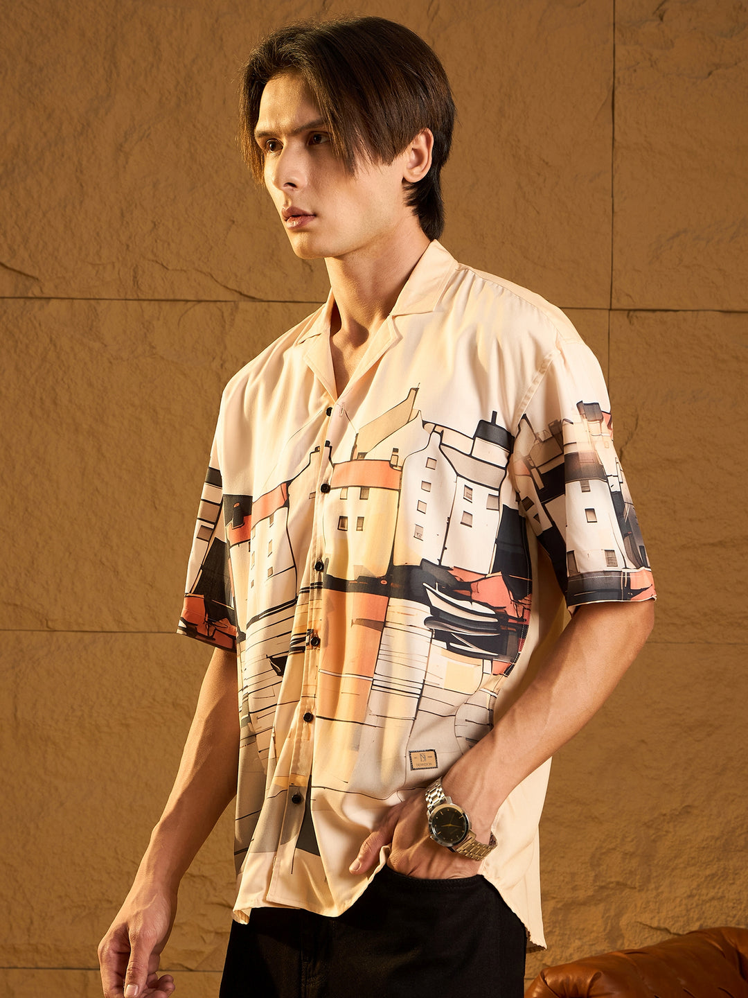 Beige and Black digital printed men's shirt features a drop shoulder, oversized fit, no pocket, Cuban collar, short sleeves, and a curved hemline with an abstract placement print
