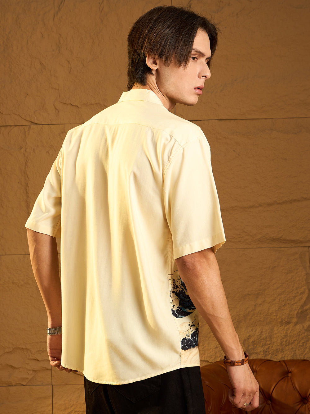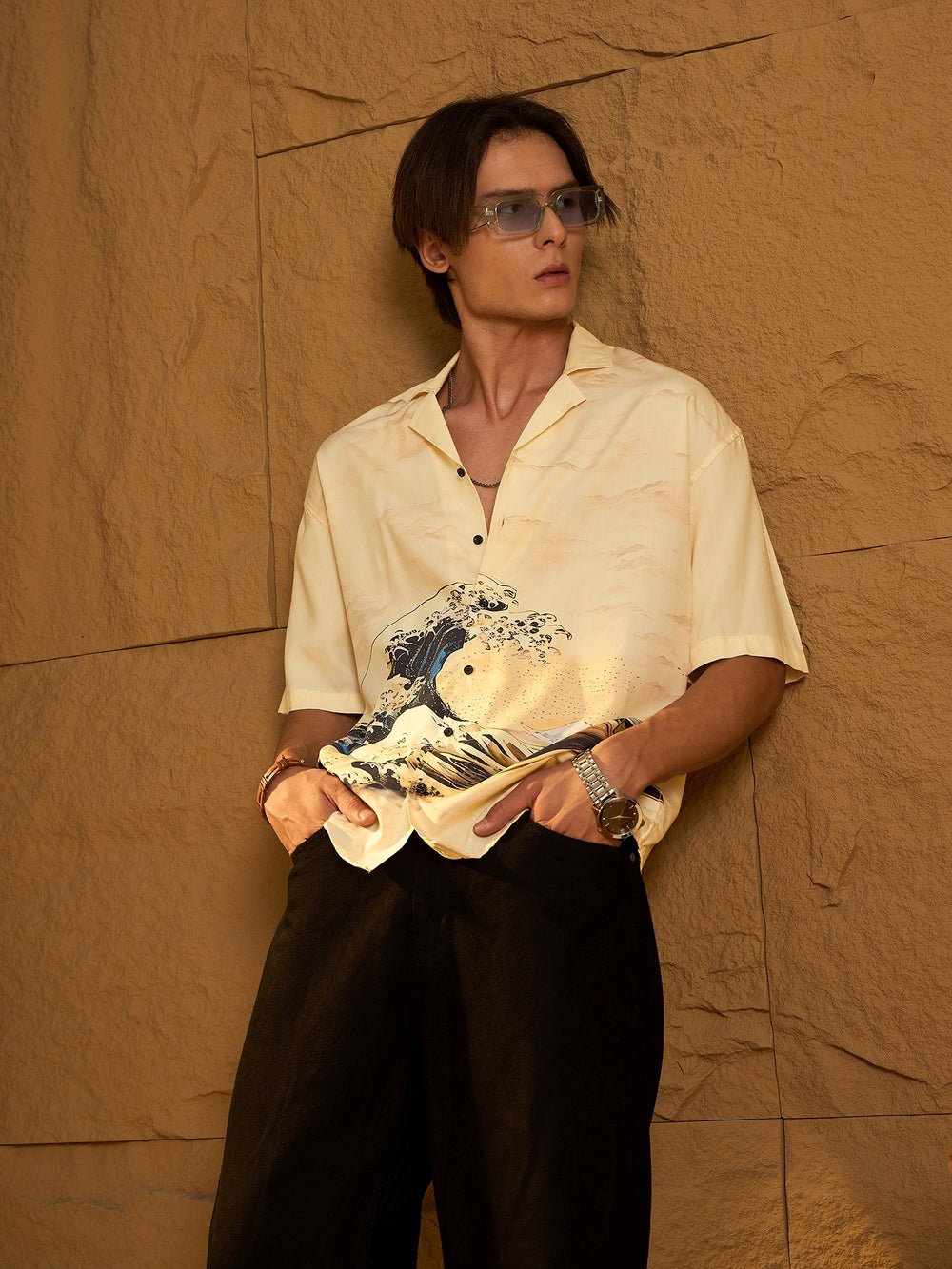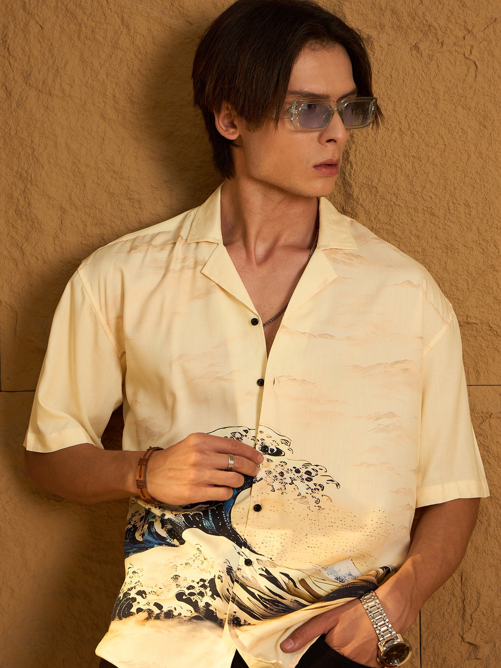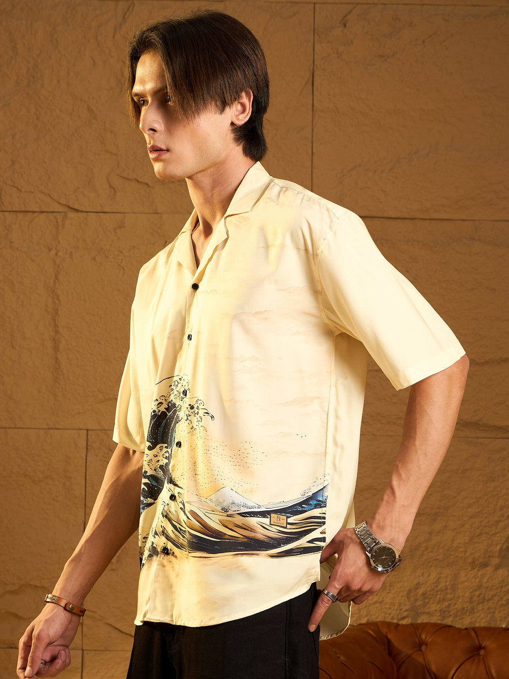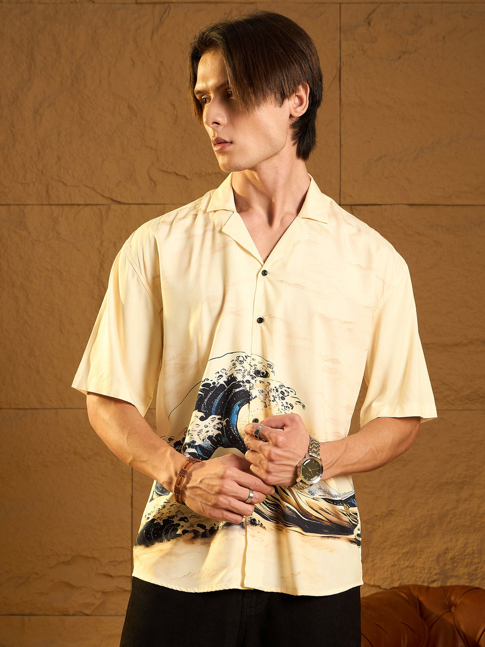 Beige digital printed men's shirt features a drop shoulder, oversized fit, no pocket, Cuban collar, short sleeves, and a curved hemline with an abstract placement print