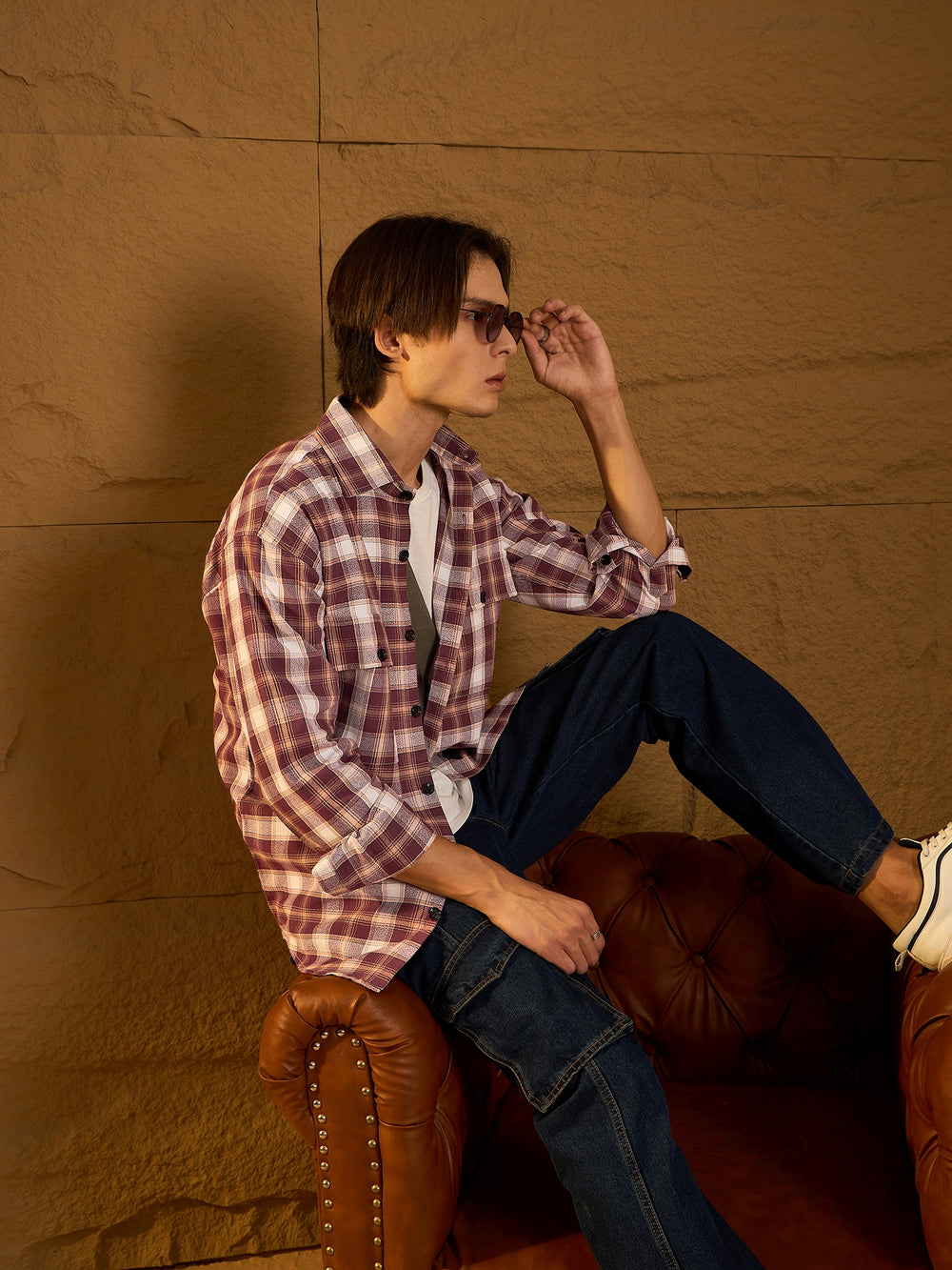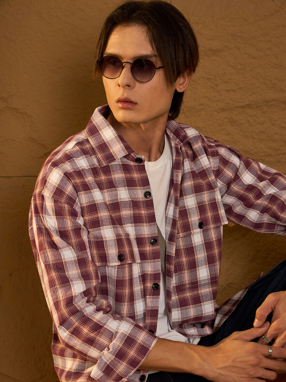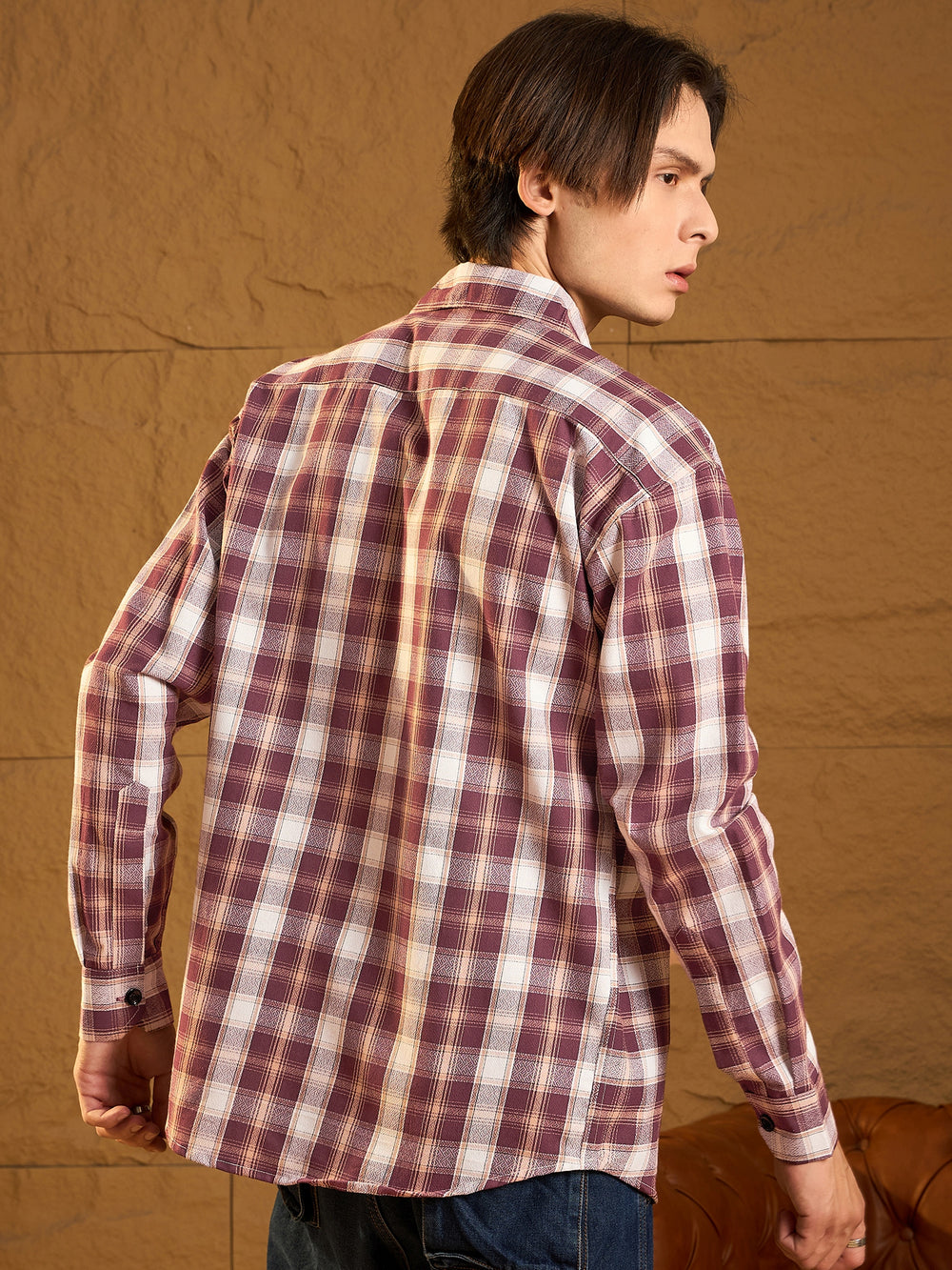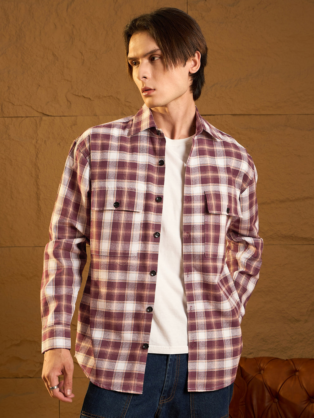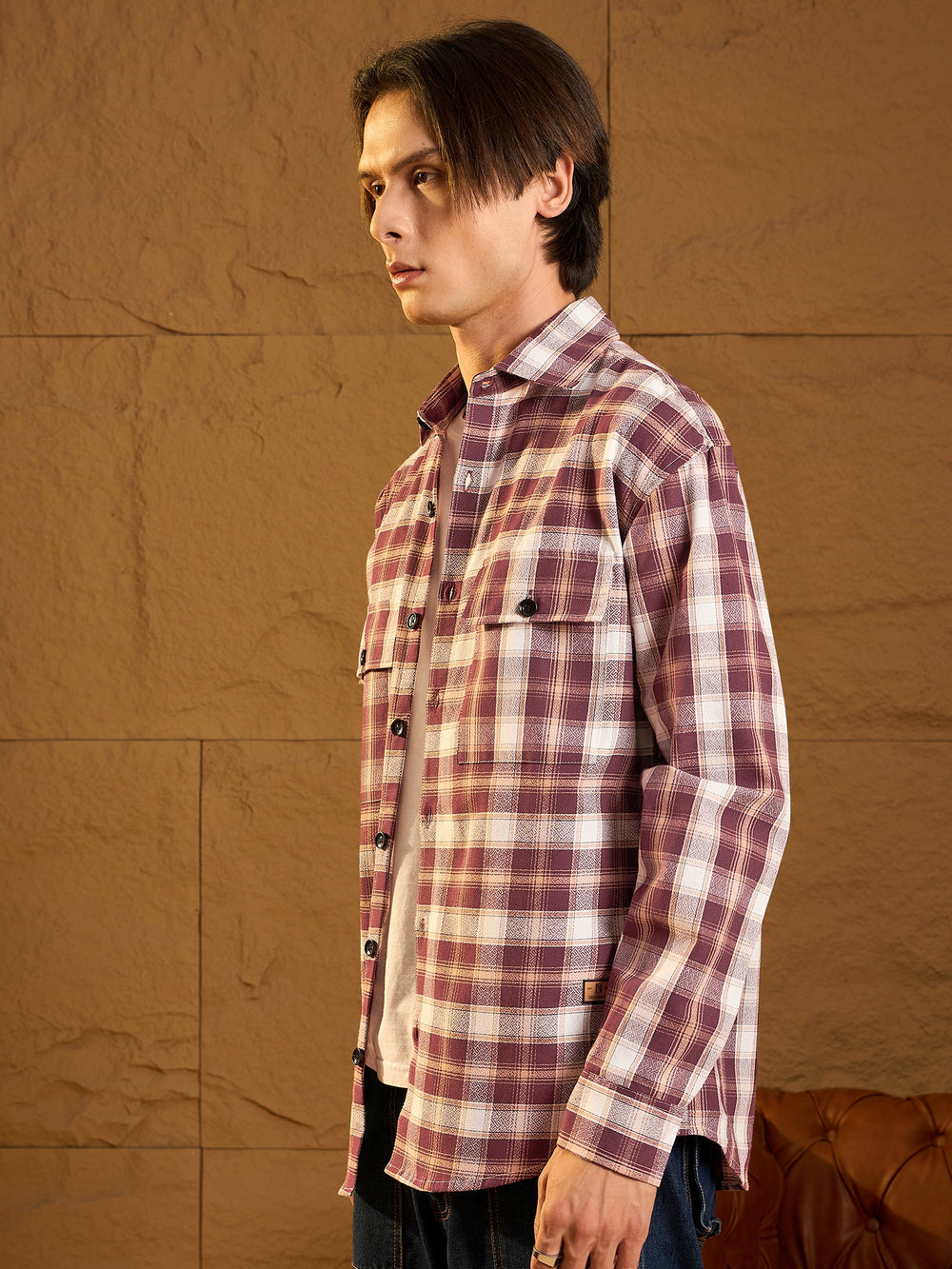 Maroon checked shacket featuring a spread collar, drop shoulders, oversized fit, full sleeves, 2 Flap pockets, and a stylish curved hemline