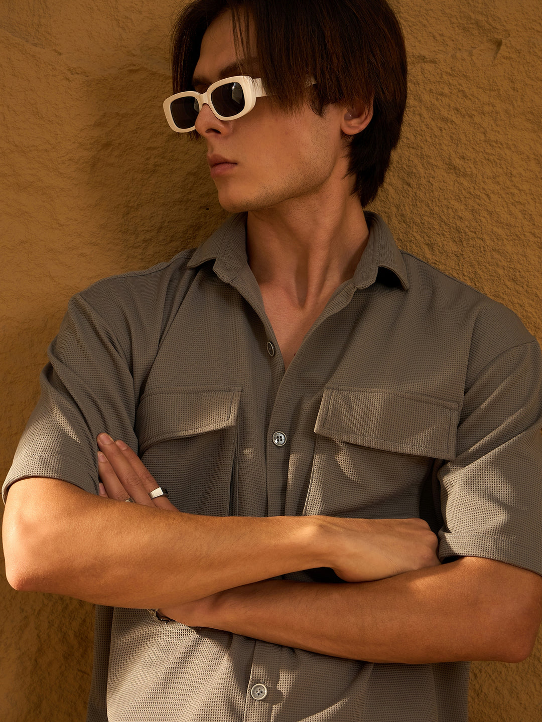 Grey Drop Shoulder Oversized opaque Casual 4way Lycre shirt ,has a Spread collar, Double pocket, button placket, Half regular sleeves, Curved hem