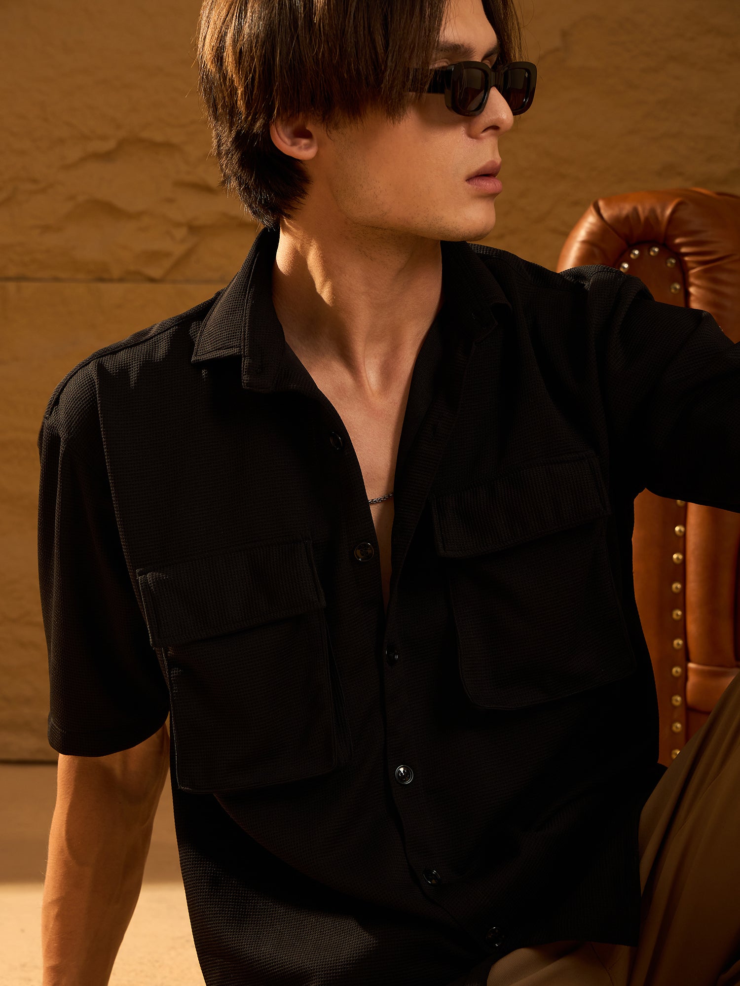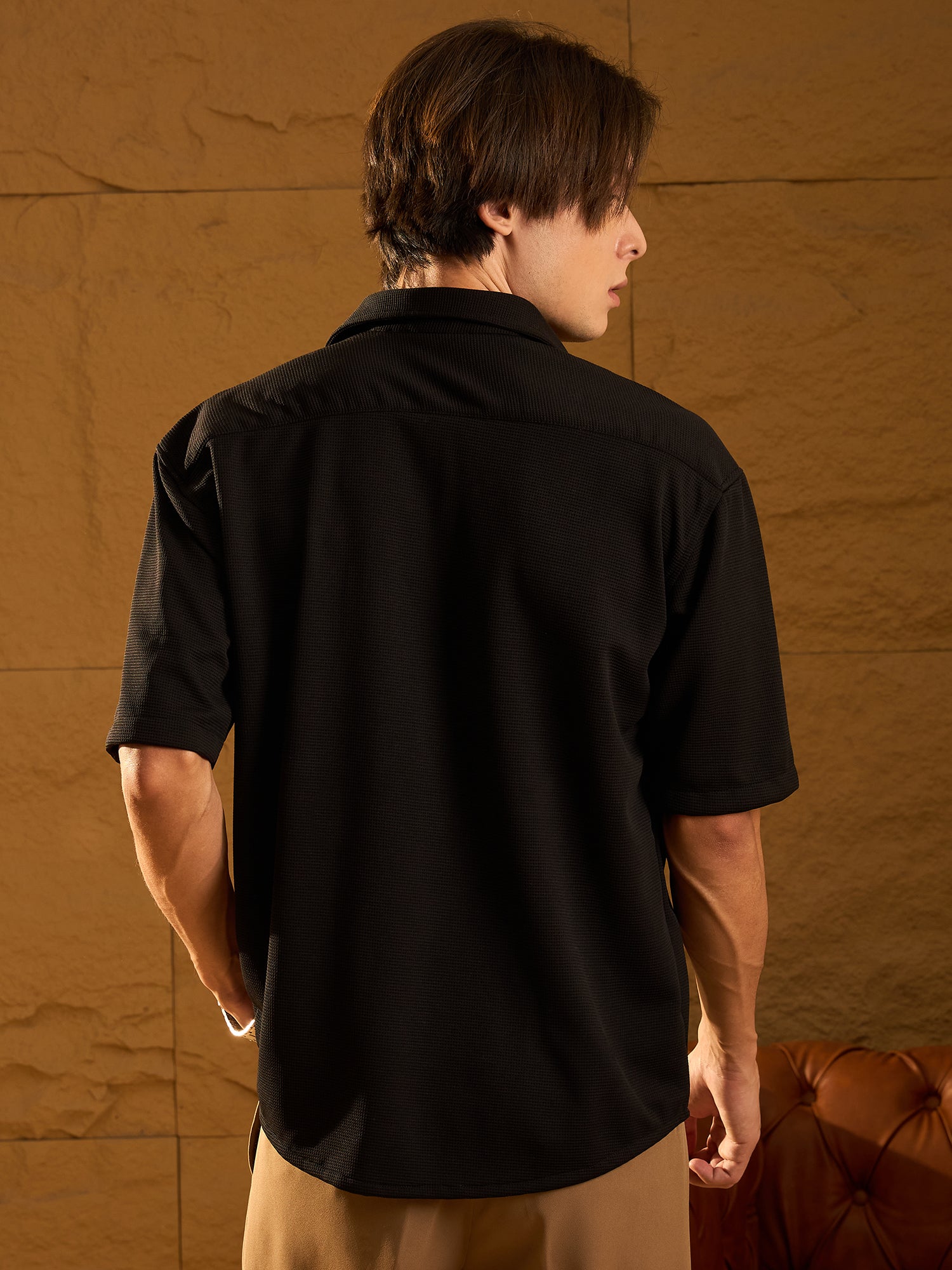 Black Drop Shoulder Oversized opaque Casual 4way Lycre shirt ,has a Spread collar, Double pocket, button placket, Half regular sleeves, Curved hem